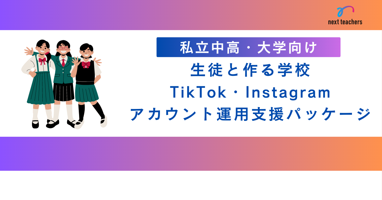株式会社NextTeachers(以下、当社)は、学校の広報活動を支援するため、生徒と先生が協力して運営する学校向けTikTok・Instagramアカウントの運用支援パッケージ「生徒と作る学校TikTok・Instagram運用支援パッケージ」の発売を開始します。