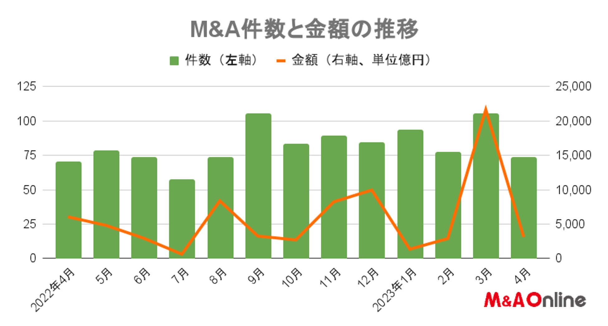 一方、4月の取引金額は3,122億円(公表分を集計)で、海外企業を買収する1,000億円台の大型案件が2つあったものの、これ以外に100億円超は1件(151億円)にとどまり、金額は伸び悩みました。