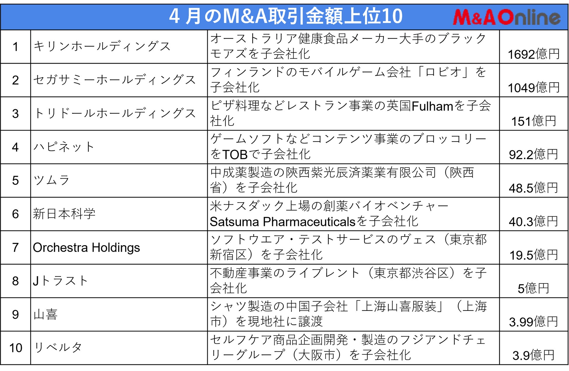 【4月M&Aレポート】3件増の73件キリンとセガサミーが1000億円超の大型買収。イオン、いなげやを統合