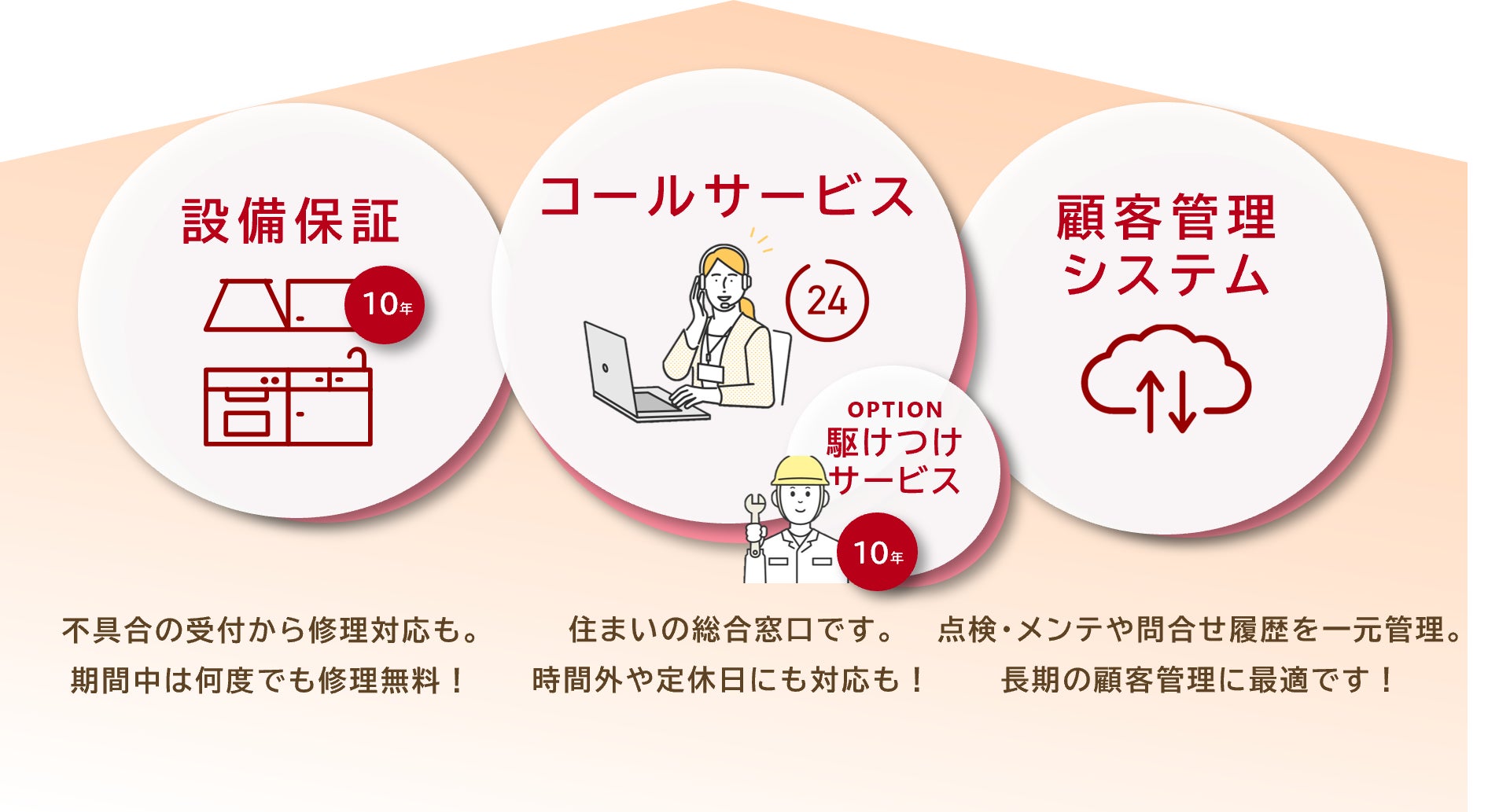 アフターサポートは住宅の設備保証、コ―ルサービス(駆けつけサービス)、顧客管理システムの3つのサービスをパッケージにしたもので、住宅事業者のアフターサービスをサポートします。
