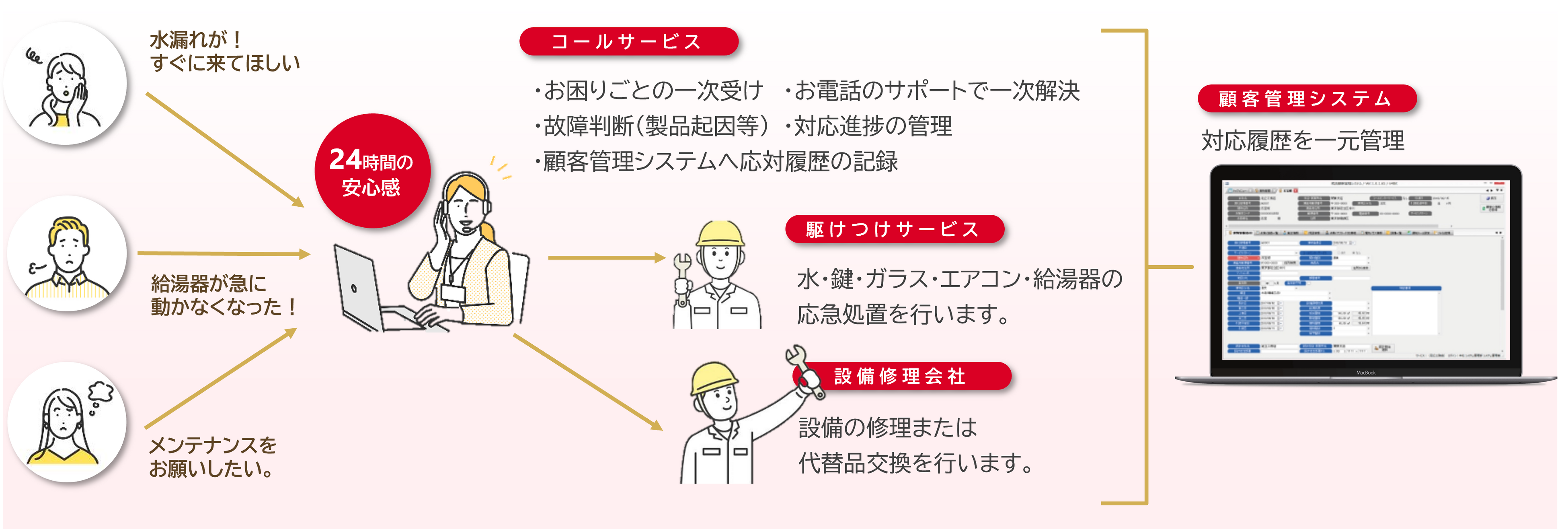 アフターサポートは住宅の設備保証、コ―ルサービス(駆けつけサービス)、顧客管理システムの3つのサービスをパッケージにしたもので、住宅事業者のアフターサービスをサポートします。
