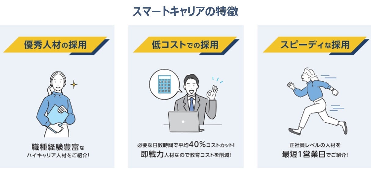 「スマートキャリア」は、時短、在宅勤務等のフレキシブルな働き方でありながらも成果を出す、ハイキャリア人材を派遣・紹介することで、企業の事業成長に貢献するサービスソリューションです。