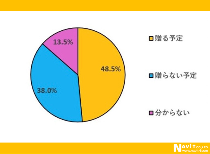 母の日にプレゼントを「贈る予定」と回答された方が48.5%で約半数いらっしゃいます。次いで「贈らない予定」が38.0%で「分からない」が13.5%と続いています。