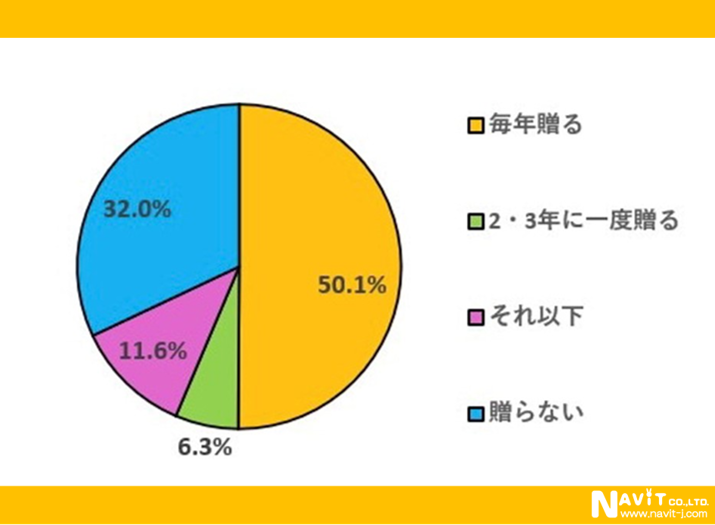 母の日ギフトを「毎年贈る」という方が50.1%です。半数の方は毎年母の日ギフトを贈っているようです。「贈らない」と回答された方が32.0%で1/3となっています。そして「それ以下」が11.6%で合わせて40%以上です。母の日ギフトを贈るハードルの高さを感じる結果です。また「2・3年に一度贈る」という方が6.3%です。