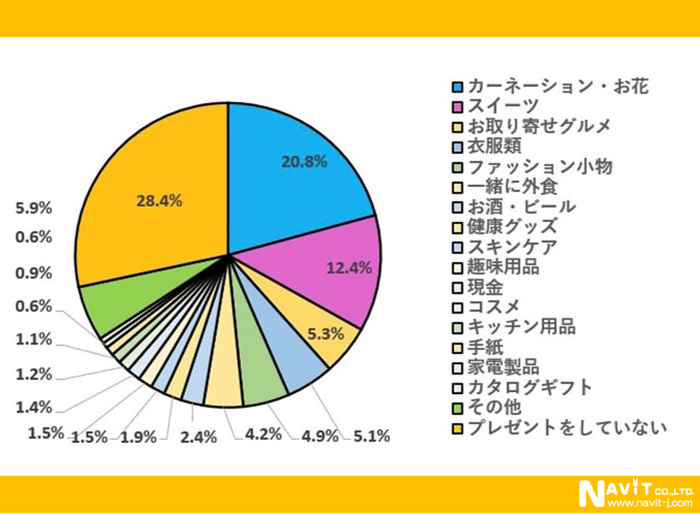 このアンケートは複数回答でいただいています。定番の「カーネーション・お花」と回答された方が20.8%と続いています。次いで「スイーツ」が12.4%、「お取り寄せグルメ」5.3%という結果になっています。