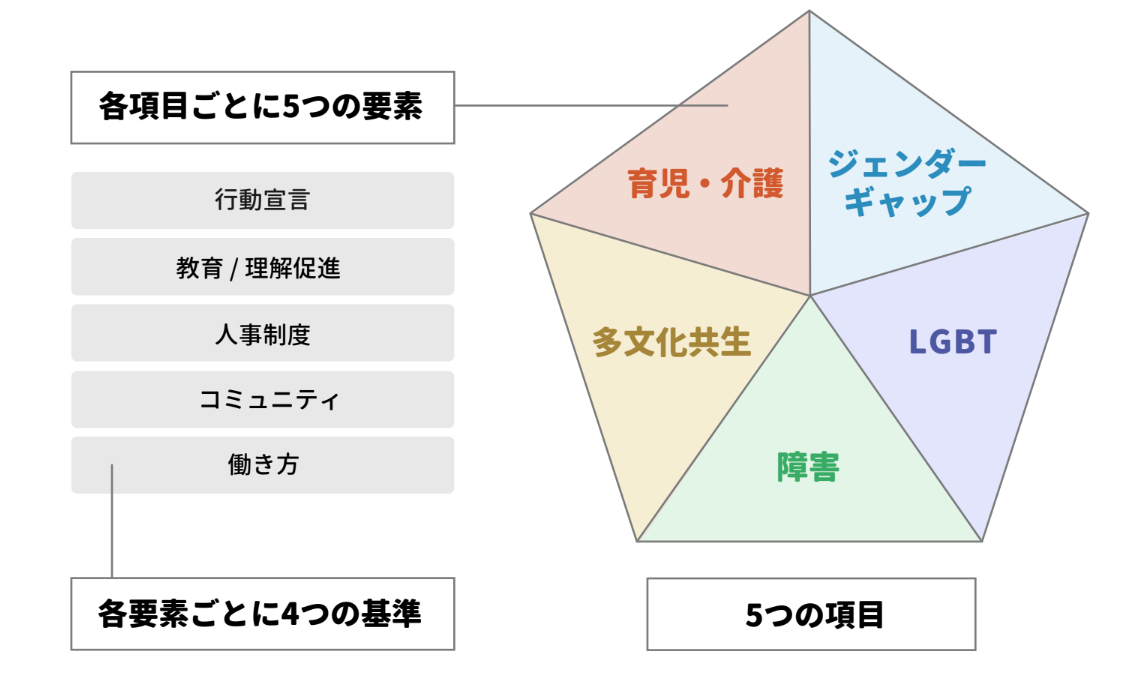 【ジェンダーギャップ】【LGBT】【障害】【多文化共生】【介護・育児】の5つの観点で構成された100項目です。D&Iの重要性・理念の理解や社内啓発だけでなく、具体的な施策も盛り込んでいます。