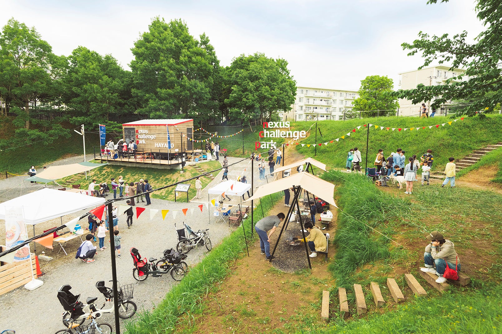 生活者起点の新たな郊外型まちづくりを目指す一環として、街の人が主人公となり新たな日常を創り出す新しい広場。「ルールに縛られない場」のブランディングとデザイン・設計施工を担当。防災焚き火スペース、既存竹林を活かした環境を整備し、遊びを誘発するコミュニティパークを実現しました。