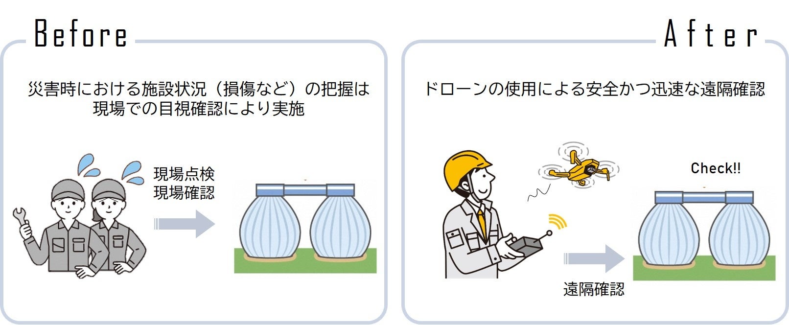 現在は災害発生時、故障・損傷状況の把握のため、現場で目視確認を行っていますが、ドローンを活用した遠隔点検により、安全かつ迅速に施設状況を把握することができます。