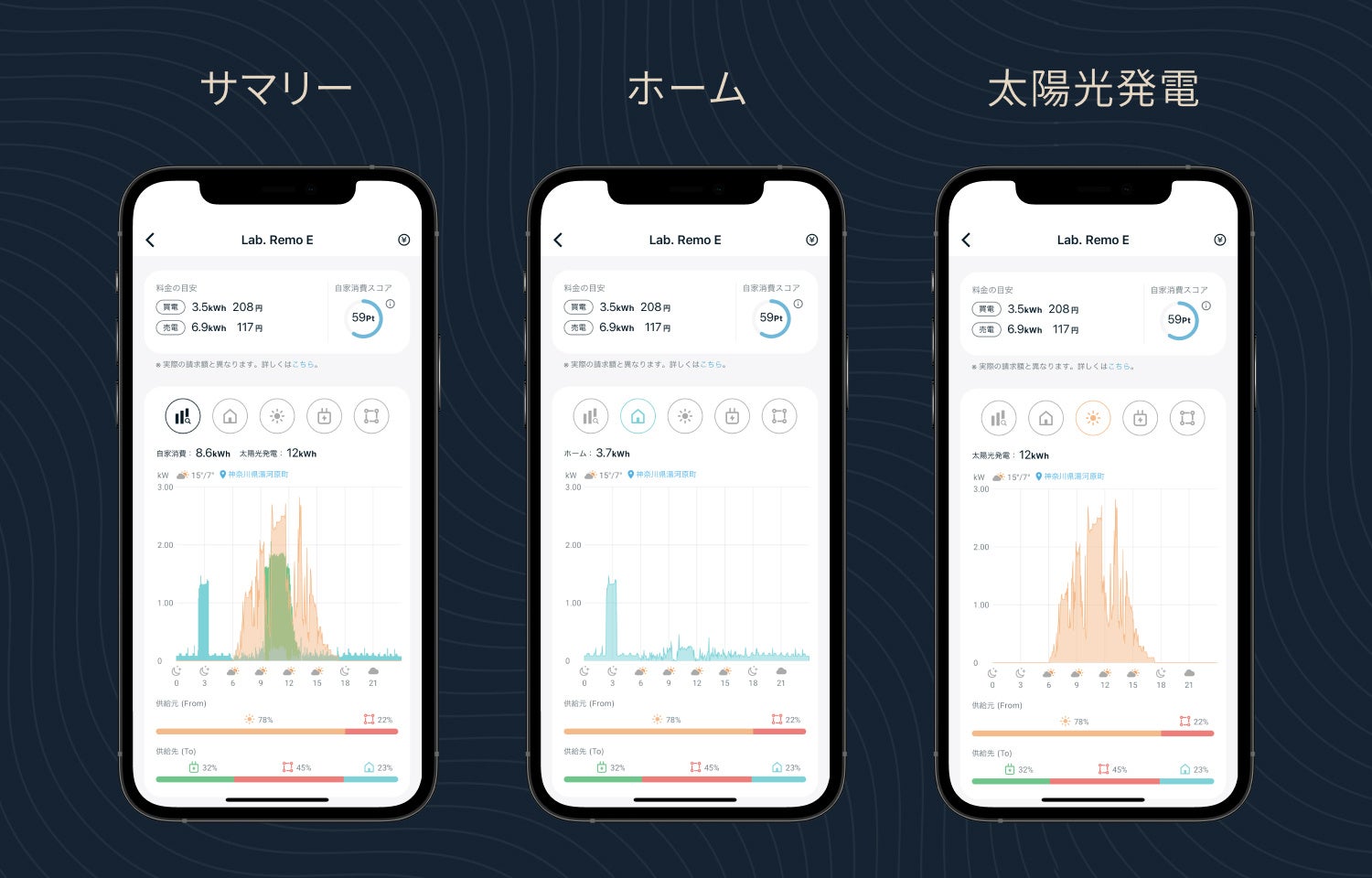 「Nature Remo E」は、スマートフォンの「Nature Remoアプリ(以下:本アプリ)」と連動して家庭内の電力消費量を数値として見える化し、登録機器をコントロールできる次世代HEMSです。今回のアップデートでは、エネルギーのグラフを改善し、5種類のタブに分けてユーザーの知りたい詳細を確認できるようになりました。天気情報の表示機能を追加し、天気や気温の変化による太陽光発電と消費電力の推移を把握いただけます。またどの時間に余剰電力が発生したか、視覚的に確認することもでき、以前よりも詳細に電力の消費状況の把握と分析を行えるようになりました。