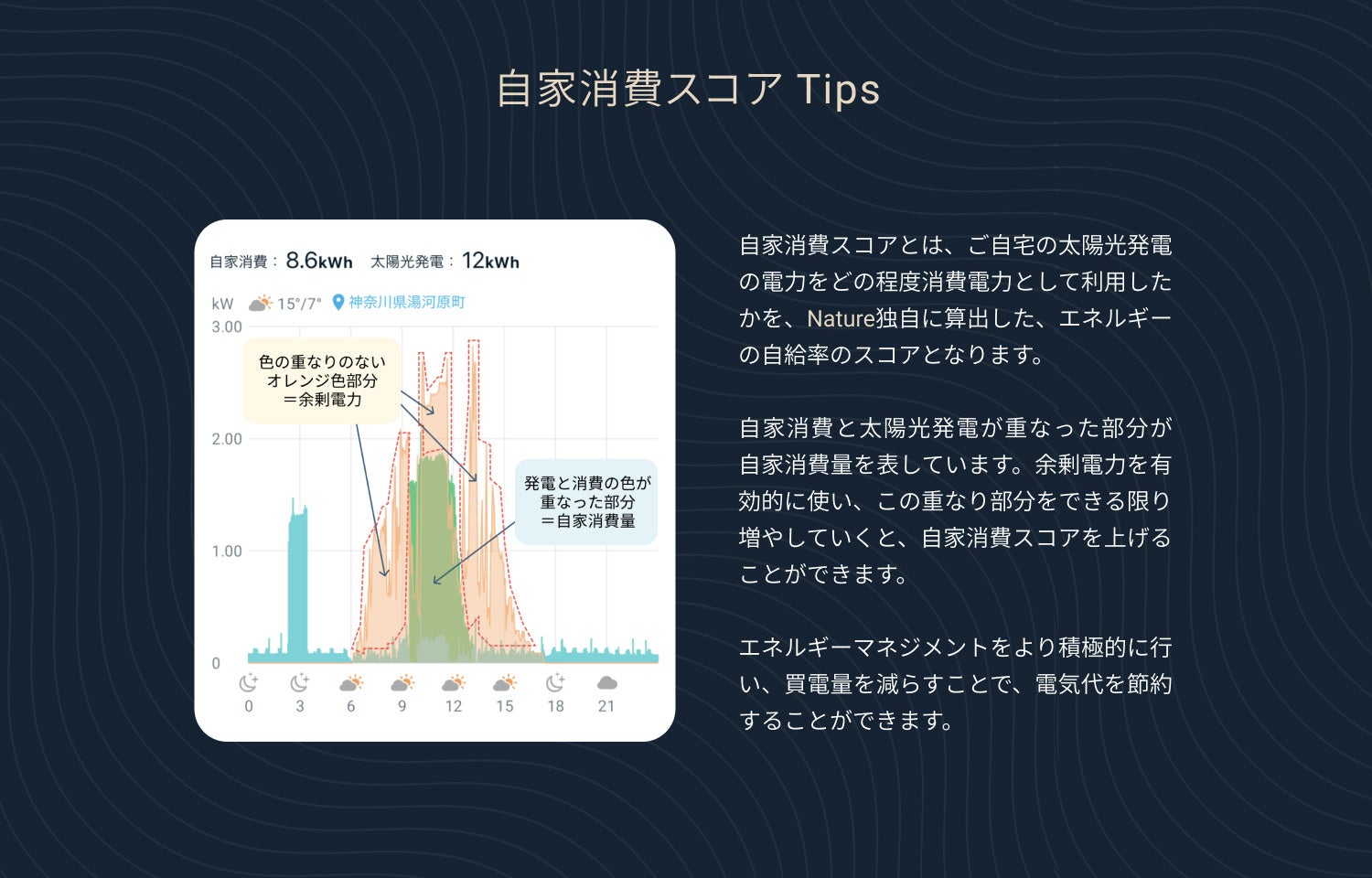 自家消費スコアを上げていただくために、エネルギーグラフの見方を案内する自家消費スコアTipsを用意して、自家消費を向上するためのノウハウもご提供しております。