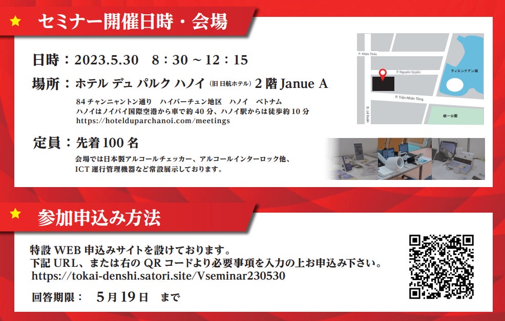 会場では日本製アルコールチェッカー、アルコールインターロック他、ICT運行管理機器など常設展示しております。ベトナムに現地法人を持たれている企業様はぜひ、現地法人へお知らせください。