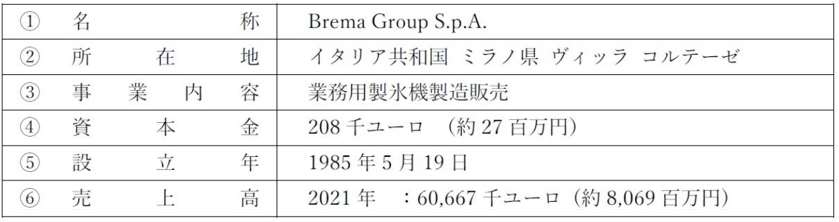 Brema社はイタリアを拠点に業務用製氷機の製造・販売を行っており、普及価格帯を中心とした広い商品ラインナップを強みに、イタリア国内に加え、南欧・東欧・中東諸国に積極的に事業展開しております。当社の欧州における業務用製氷機事業は、高価格帯商品を中心に、英・仏・独・北欧等にて展開しておりましたが、今回Brema社を子会社化することで、当社の高価格帯商品にBrema社の普及価格帯商品が加わり、プロダクトポートフォリオ上の補完シナジーや南欧・東欧・中東諸国への拡販が期待できます。