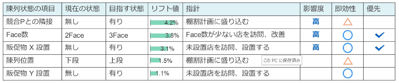 本取り組みでは、個店別の陳列実態を、陳列個数や位置などの指標と画像で定量的に捉え、陳列計画との乖離を明確にできます。さらに、売上・利益との関係を分析することで、どのような陳列にすると売上・利益が最大化されるのかが明らかとなり、メーカー営業部門の日々の改善活動や小売事業者との商談において、どのような陳列にすると良いかの指針が定まります。