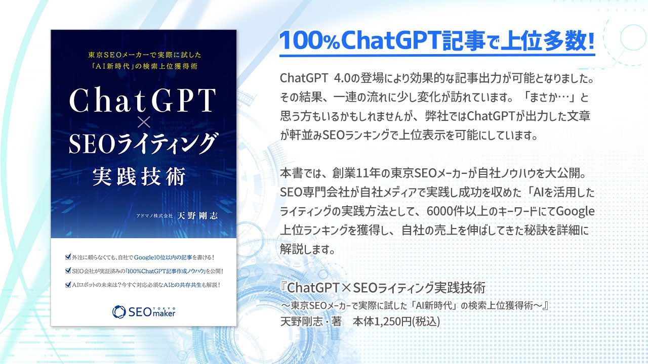 「ChatGPT×SEOライティング実践技術 ~東京SEOメーカーで実際に試した「AI新時代」の検索上位獲得術~」は、SEO専門会社が実際に体験し、成功を収めたAIを活用したSEOライティングの実践方法を紹介した1冊です。創業11年の東京SEOメーカーが自社のノウハウを大公開。6000件以上のキーワードで上位ランキングを獲得し、自社の売上を伸ばしてきた秘訣を詳細に解説します。