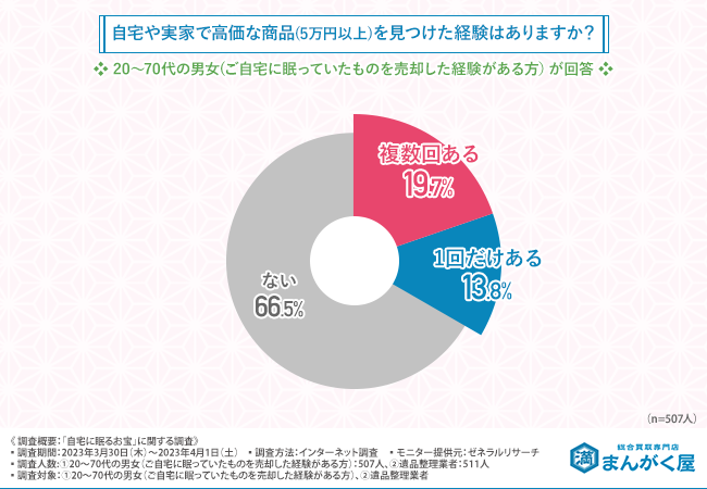 「自宅や実家で高価な商品(5万円以上)を見つけた経験はありますか?」と質問したところ、『ない(66.5%)』と回答した方が最も多く、次いで『複数回ある(19.7%)』『1回だけある(13.8%)』と続きました。
