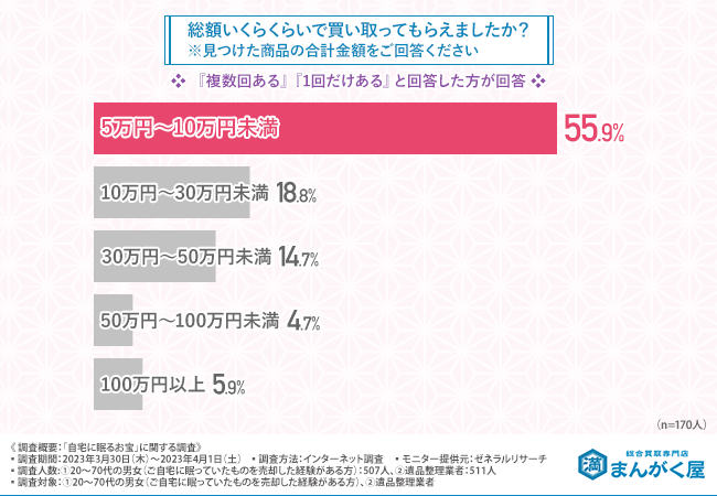 「総額いくら程度で買い取ってもらえましたか?※見つけた商品の合計金額をご回答ください」と質問したところ、『5万円~10万円未満(55.9%)』と回答した方が最も多く、次いで『10万円~30万円未満(18.8%)』『30万円~50万円未満(14.7%)』『50万円~100万円未満(4.7%)』『100万円以上(5.9%)』と続きました。