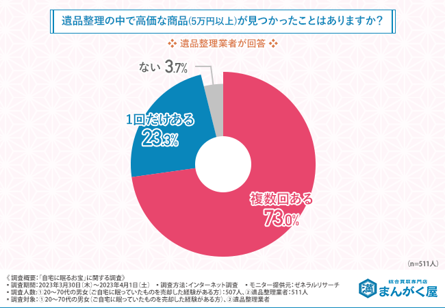 「遺品整理の中で高価な商品(5万円以上)が見つかったことはありますか?」と質問したところ、『複数回ある(73.0%)』と回答した方が最も多く、次いで『1回だけある(23.3%)』『ない(3.7%)』と続きました。