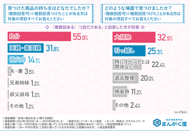そこで今回、総合買取専門店『まんがく屋』(https://www.mangakuya.com/)は、①20~70代の男女(ご自宅に眠っていたものを売却した経験がある方)②遺品整理業者を対象に、「自宅に眠るお宝」に関する調査を実施しました。