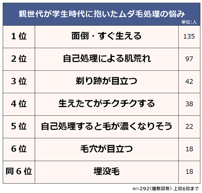 親世代が学生時代に抱いたムダ毛処理の悩み1位は「面倒・すぐ生える」