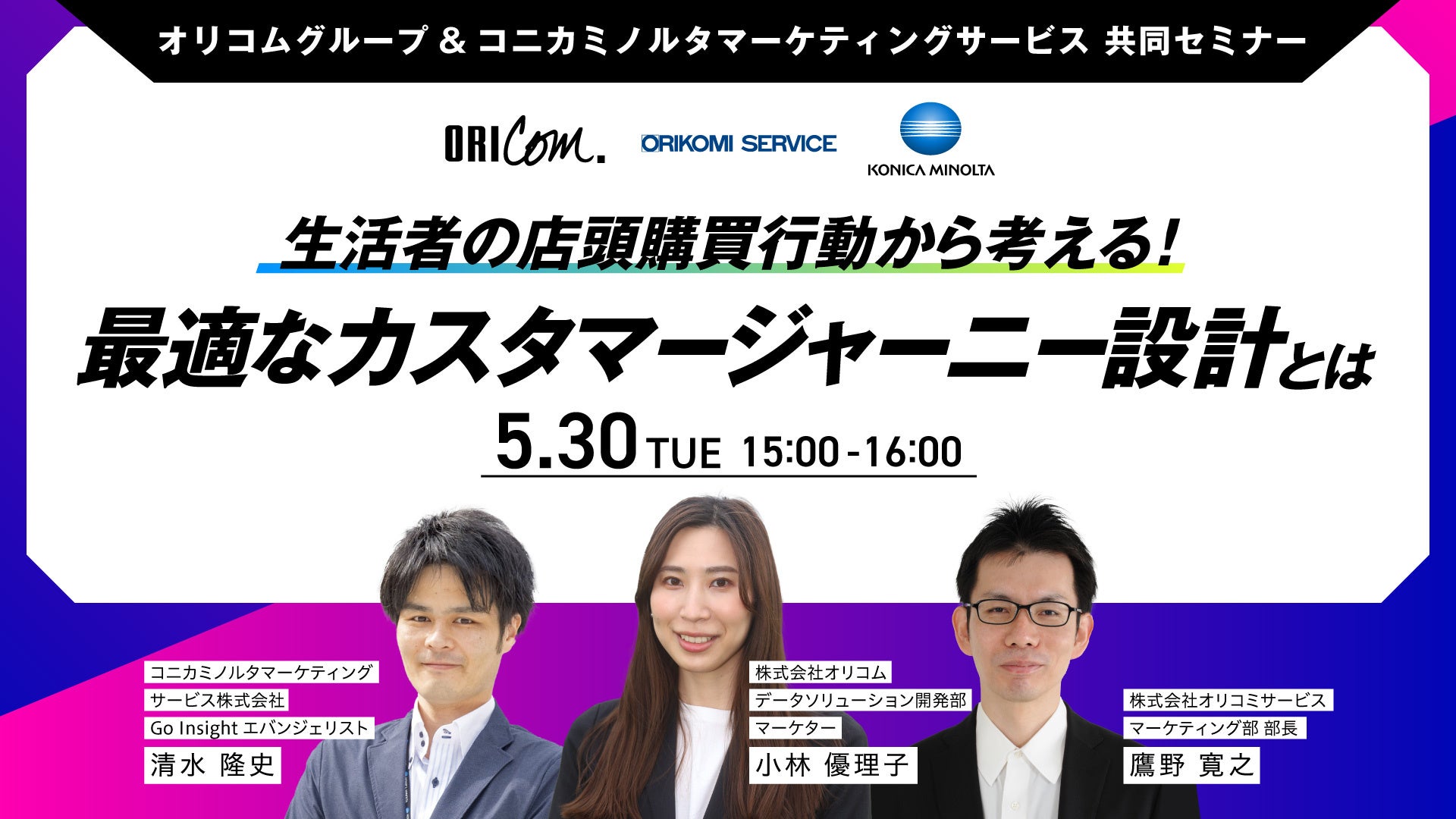 本セミナーでは、店頭カメラ調査のパイオニアであるコニカミノルタマーケティングサービスの清水氏、リテール様と生活者をつなぐチラシ等のソリューションを日々研究・運用しているオリコミサービス鷹野氏をお招きし、生活者の店頭行動に関するお話を伺います。また、スーパーマーケットでの3カテゴリの商品棚前行動データ分析結果から得られた、適切なカスタマージャーニーを設計するためのヒントをご紹介いたします。また、今後、オリコムグループとコニカミノルタマーケティングサービス様とで進めていく取り組みの一端についてもお話いたします。
