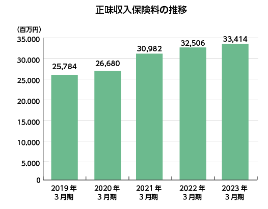 新たなブランドキャラクターの起用などによるマーケティング施策の強化が奏功し、昨年度に続き、主力商品である自動車保険の販売が好調に推移しました。またDX・CXの取り組みや事業法人とのオープンアライアンスなどを推進した結果、元受正味保険料(※1)が49,654百万円(対前期比3.0%増)、正味収入保険料(※2)が33,414百万円(同2.8%増)、保険引受収益が33,437百万円(同1.1%増)となり、経常収益は34,110百万円(同1.4%増)となりました。