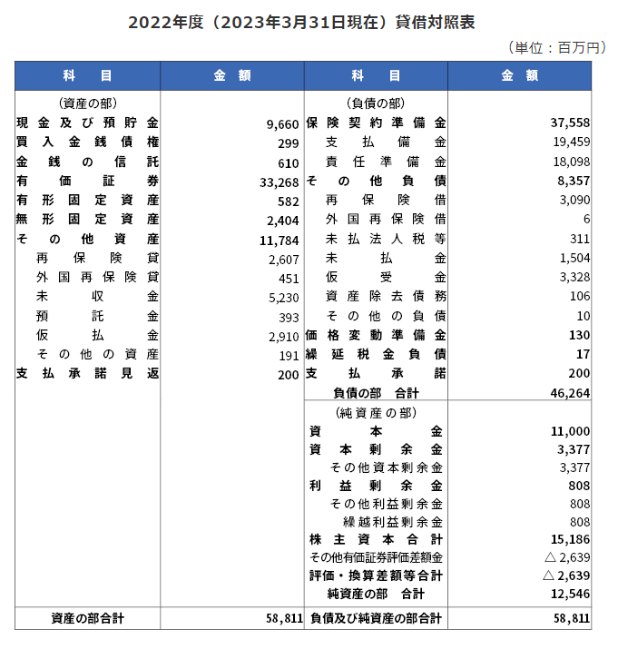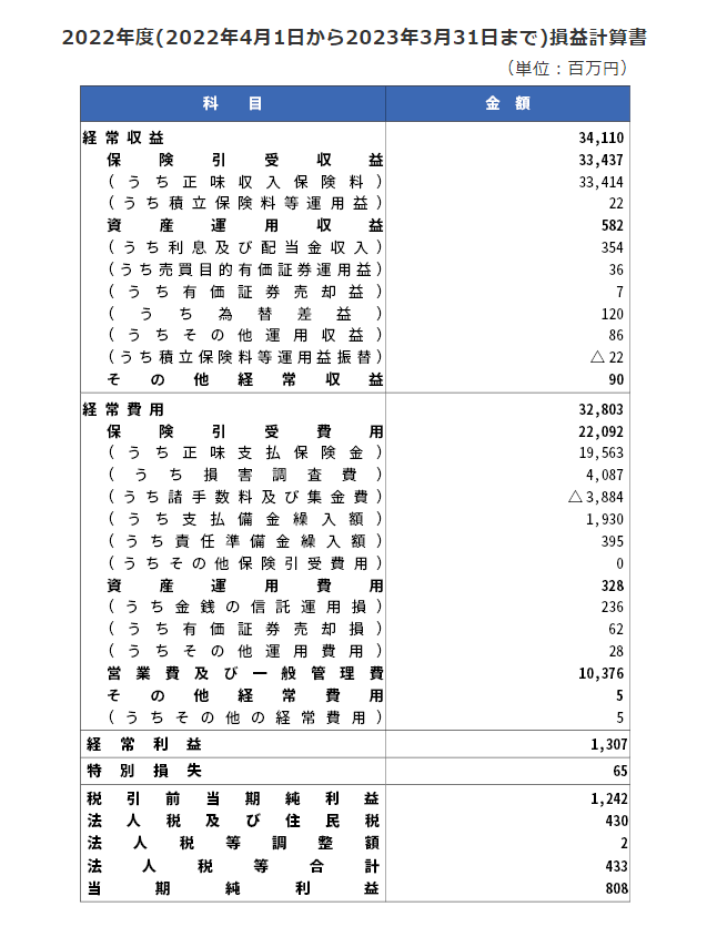 一方、保険引受費用が22,092百万円(対前期比1.0%減)、営業費及び一般管理費が10,376百万円(同6.9%増)、その他経常費用が5百万円(同83.5%減)となり、経常費用は32,803百万円(同1.3%増)となりました。