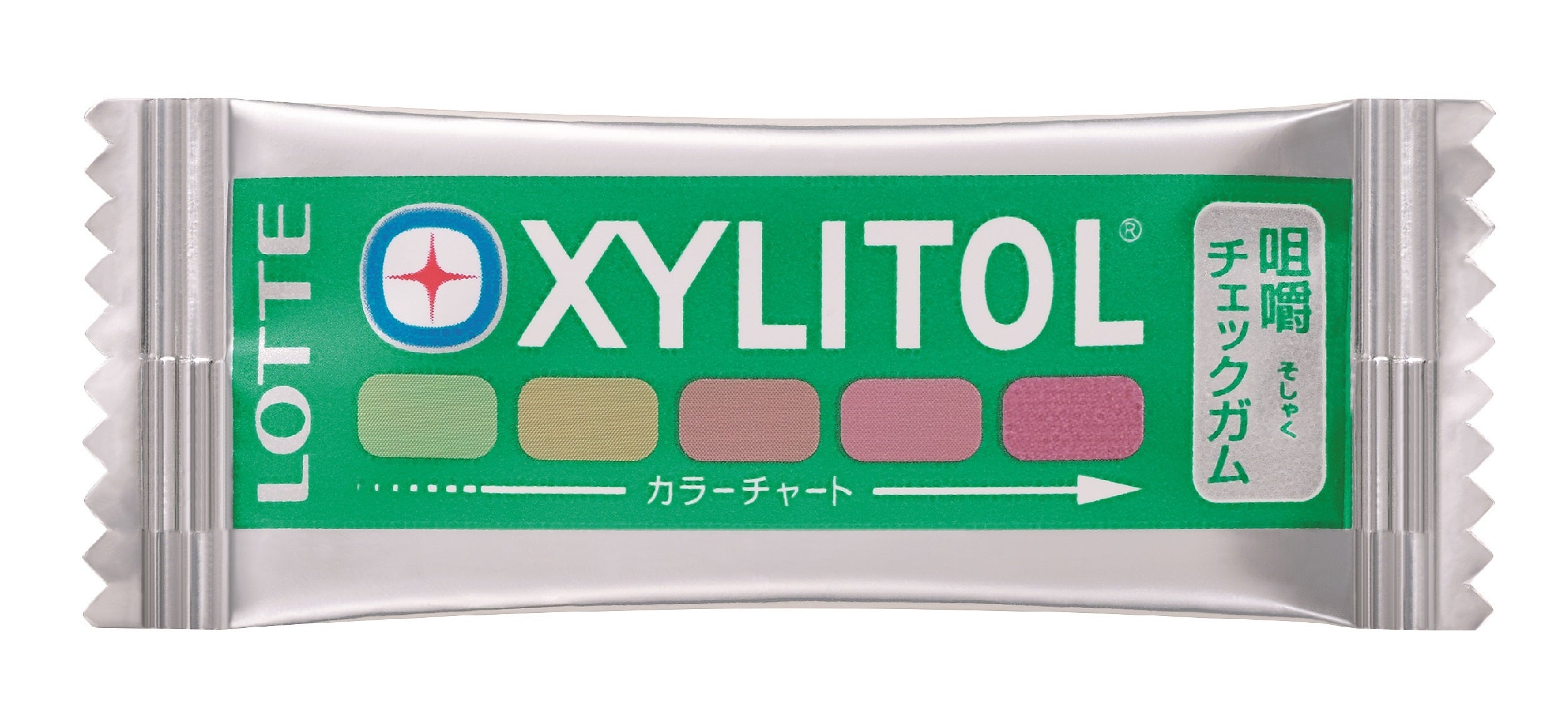 キシリトール咀嚼チェックガムには、キシリトールの他にクエン酸、未発色色素、青色色素、黄色色素などが含まれています。この未発色色素は酸性環境下では無色、中性・アルカリ性になると赤色に発色します。咀嚼の進行と共に、含有成分が唾液中に流出します。クエン酸の流出によりガム内部のpHが中性・アルカリ性へと変化していくに従って、未発色色素は赤くなっていきます。その結果として、ガム全体が赤色へと変化していきます。