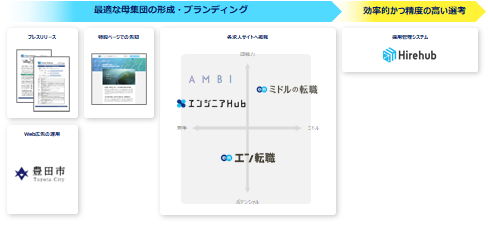 プレスリリースや特設ページ、Web広告での告知に加え、各求人サイトでの集客支援を行ないます。『エン転職』『AMBI』『ミドルの転職』 『エンジニアHub』とターゲットの異なる4つの求人サイトを活用することで、ターゲットへ網羅的に求人をお届け。さらに採用管理システム『Hirehub』もあわせて提供し、選考フローを支援。求職者と同社の適切なマッチングを実施します。