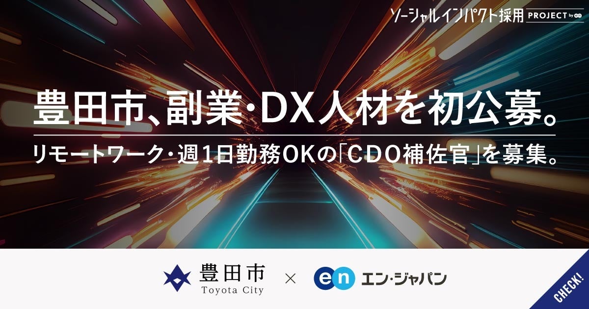 自動車工場のイメージが強い同市ですが、実は7割ほどが森林地域という豊かな自然を持つ都市でもあり「デジタル田園都市」のモデルとなりうる街。DXを推進し、未来のスタンダードとなるものを先駆けて形にしていくべく、2021年に「豊田市デジタル強靱化戦略」を策定。総務省からの出向で新たにCDO(最高デジタル責任者)を迎えるなど、デジタル社会の実現に向けて、新たな取り組みを加速させています。今後、さらにデジタル活用を強化していくため、今回エン・ジャパンを通して、同市初となる“副業人材”での「CDO補佐官」を公募します。