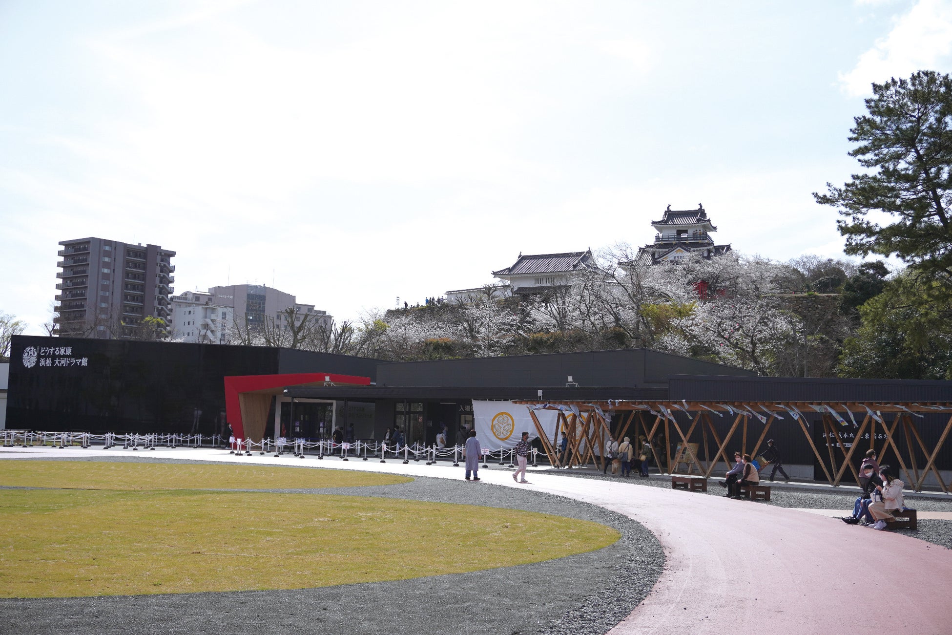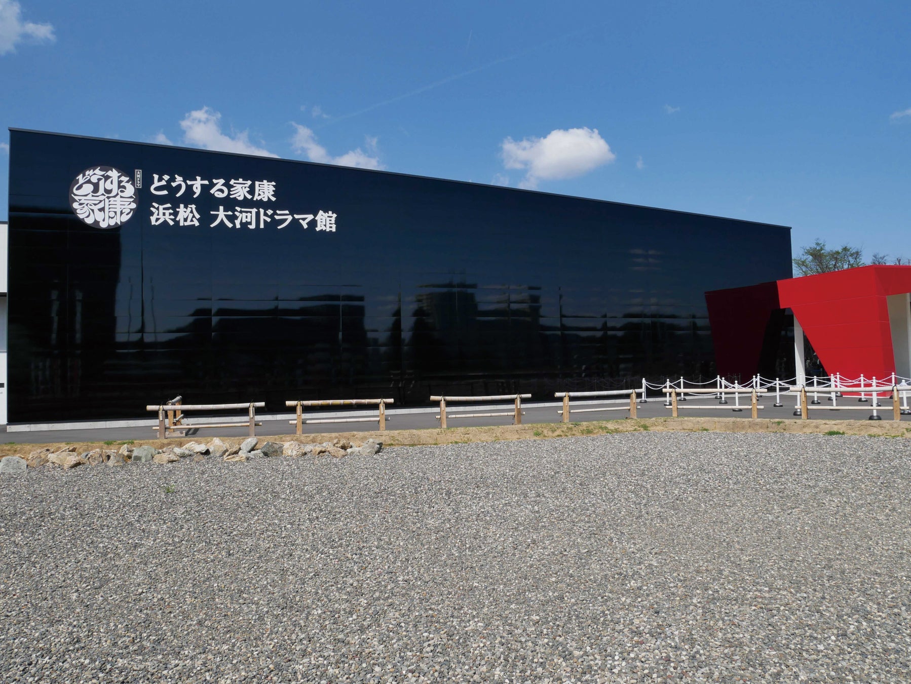 どうする家康 浜松 大河ドラマ館は、施設をゼロから建設しました。光沢のある黒い外壁は、浜松の主要産業の一つであるピアノをモチーフとしたデザインになっています。それは、ピアニスト稲本響さんが奏でるドラマのテーマ曲「暁の空」が聴こえてくるかのようです。大河ドラマ館の中は、天井を高く設計し、ドラマの世界観をダイナミックに楽しめる大道具や大迫力のスクリーンを展示しています。空間の広さを活かした、印象に残るコンテンツが揃っています。