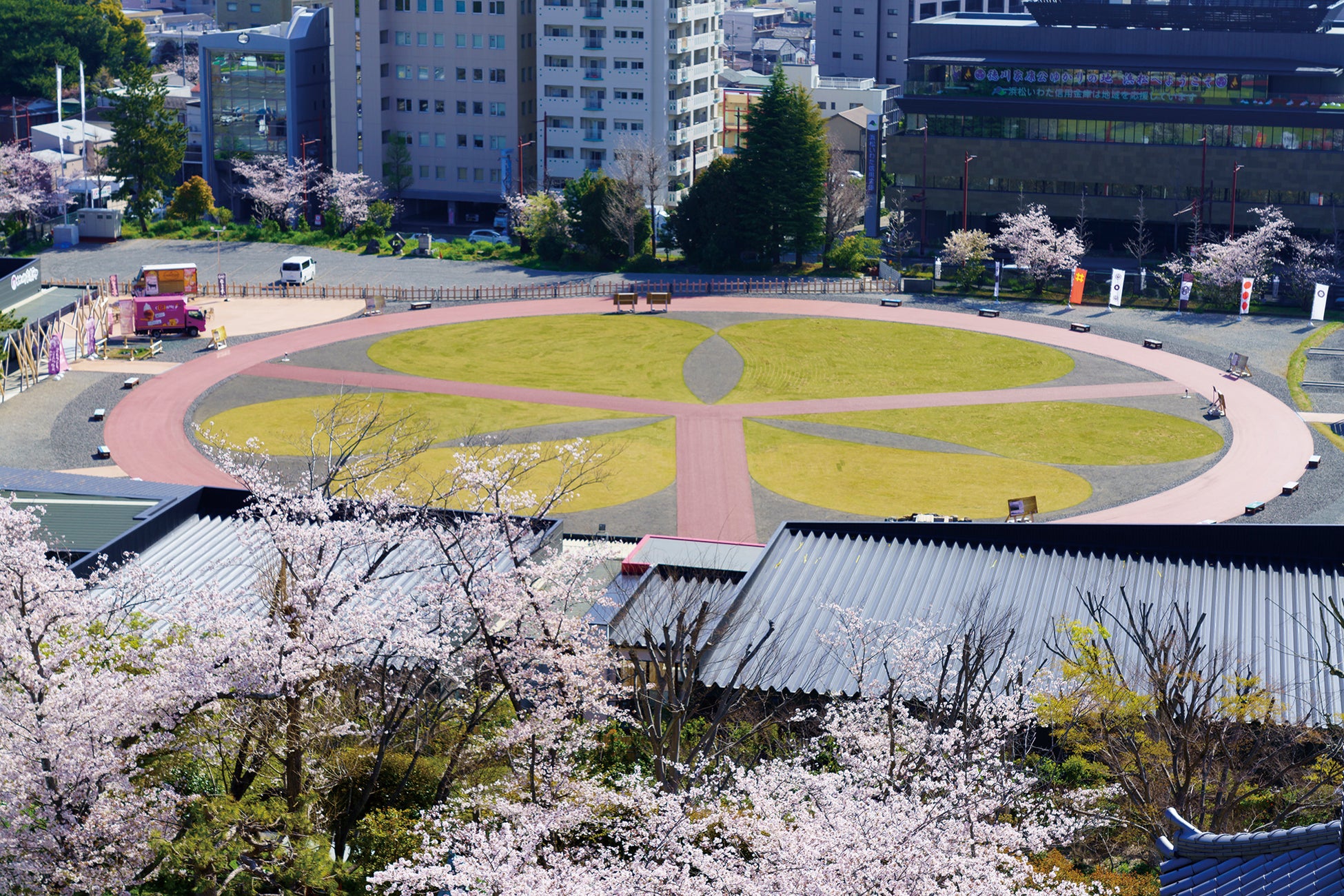 ゲートをくぐり広場「浜松出世パーク」へ進むと、東西に少し長い楕円形の芝生広場があります。随所に家康公時代の浜松城を学べるパネルが設置されているので、当時の浜松城を想像しながら、ぐるりと散歩をお楽しみください。実は、この広場は三つ葉葵で知られる徳川家の家紋をイメージして造られており、浜松城天守閣から広場を見下ろすと、楕円形ではなく美しい円形の葵紋に見えるように設計されています。ぜひ写真におさめて見てください。
