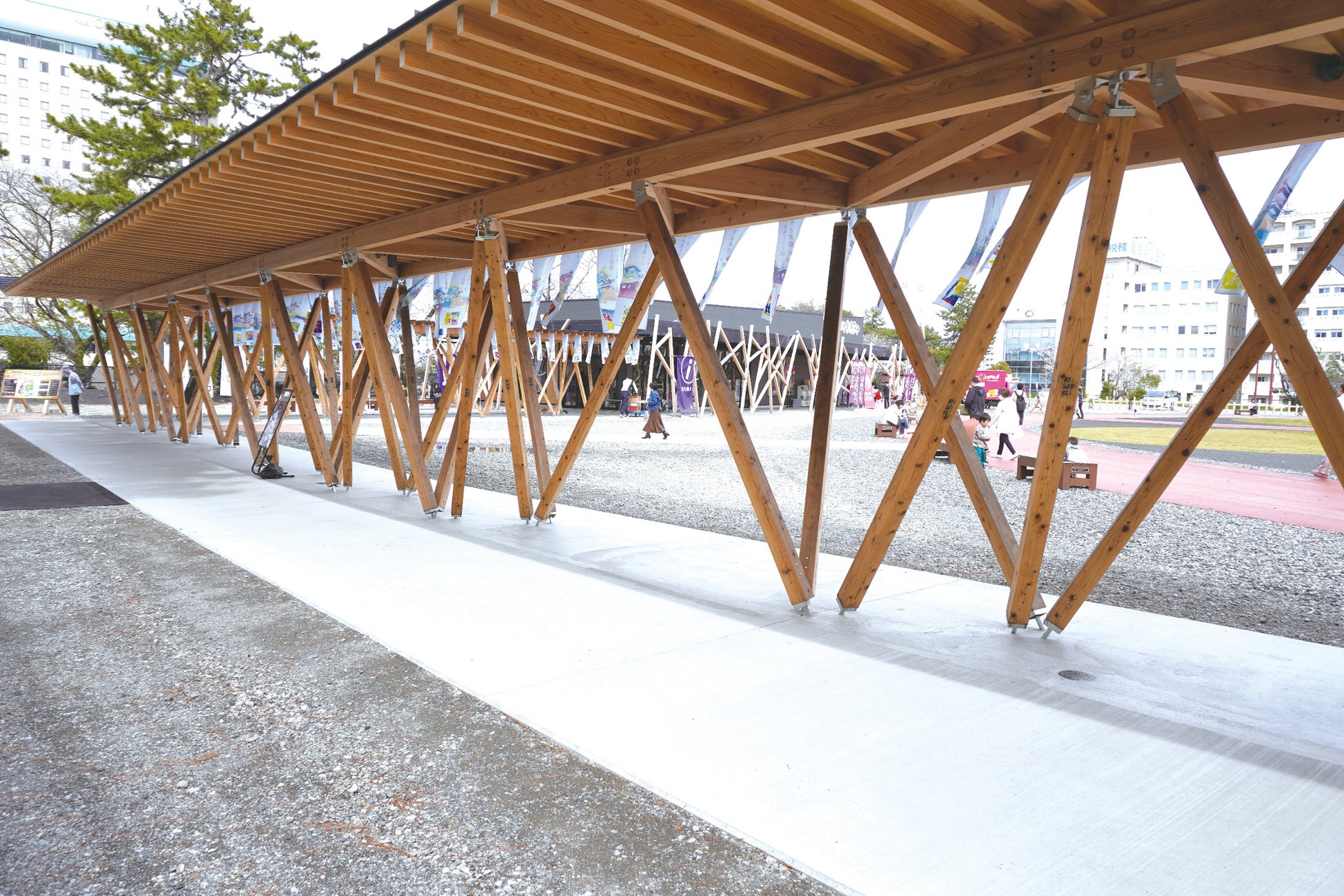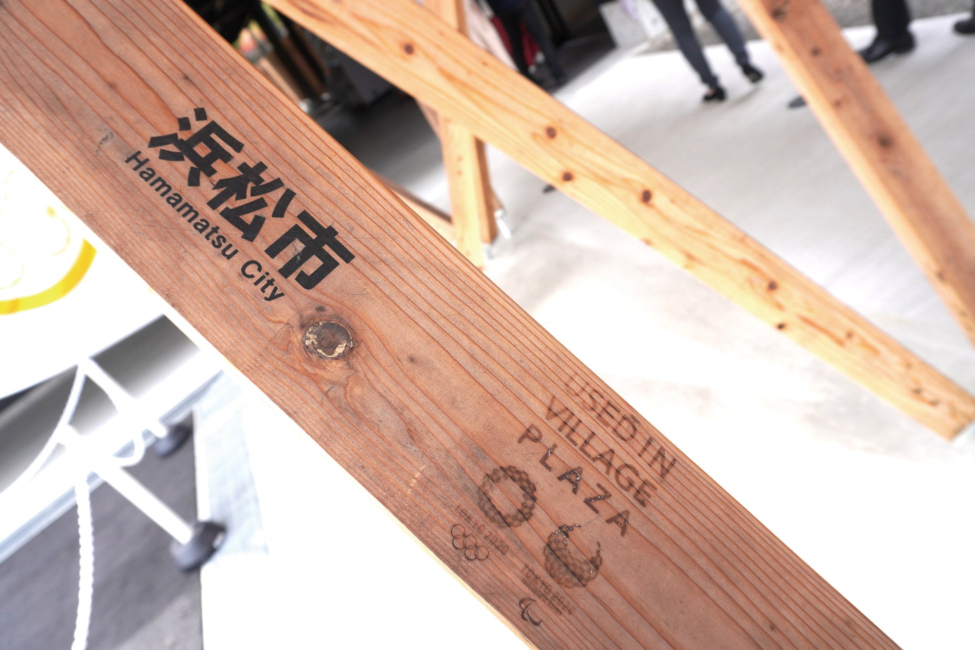 浜松出世パーク内は、日本三大美林の1つである天竜美林をモチーフに、装飾が施されています。天竜杉はサステナブルな素材として世界的に注目を集めるFSC認証材。よく見ると、「USED IN VILLAGE PLAZA」との刻印が!東京2020オリンピック・パラリンピックの選手村で使用されたレガシー材です。ここで使用されているのは35立米!家1軒分の木材が使われています。