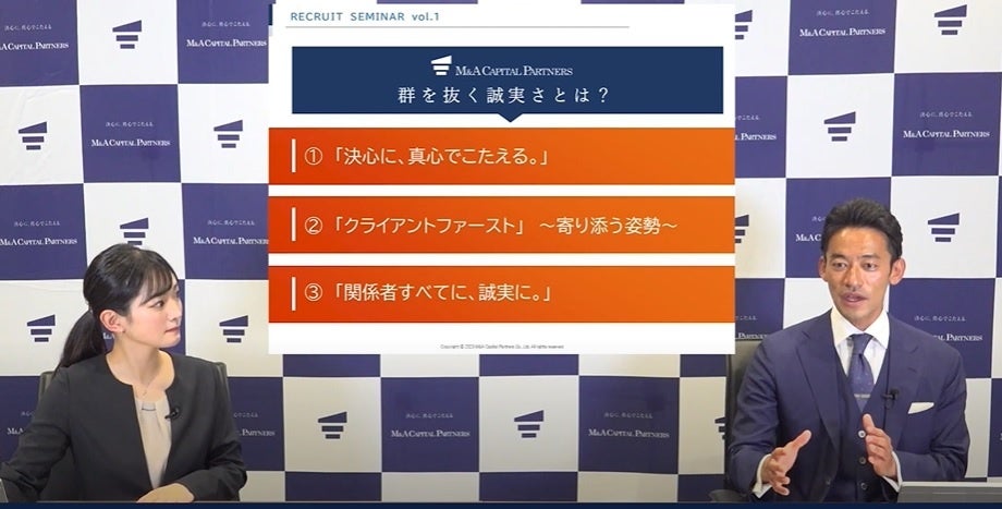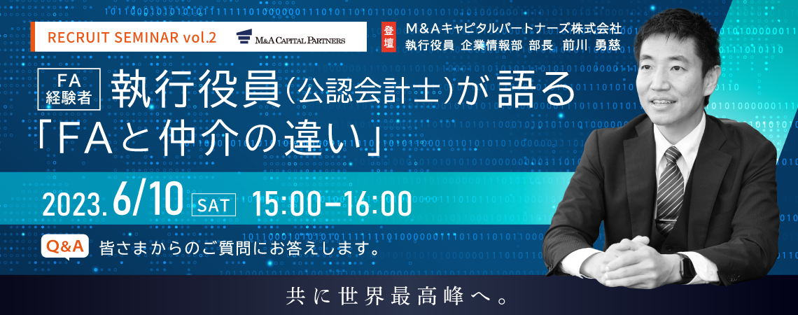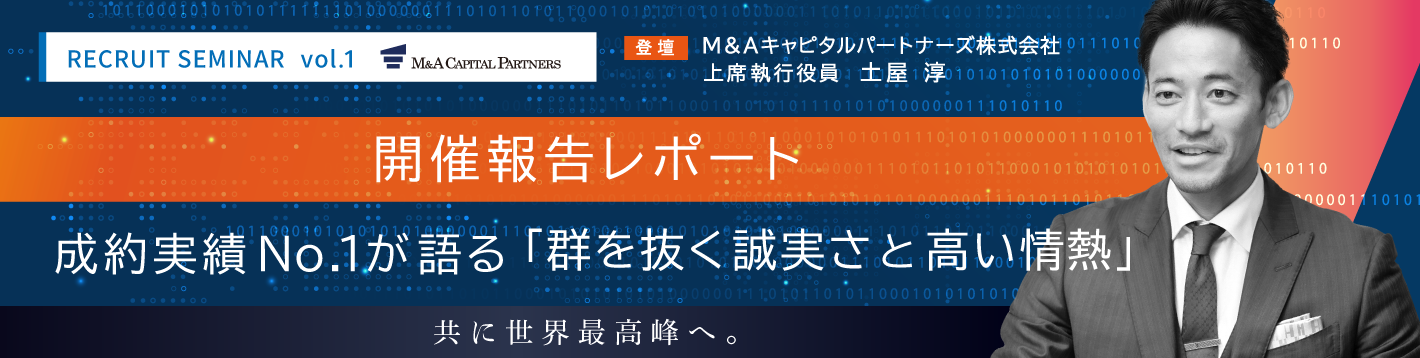 今回の採用セミナー開催では、共に「世界最高峰の投資銀行」を創っていく仲間に向けたメッセージを業界を代表するM&Aアドバイザーからお伝えし、M&Aキャピタルパートナーズおよび、実際に活躍するM&Aアドバイザーについて深く知っていただくことを目的としております。
