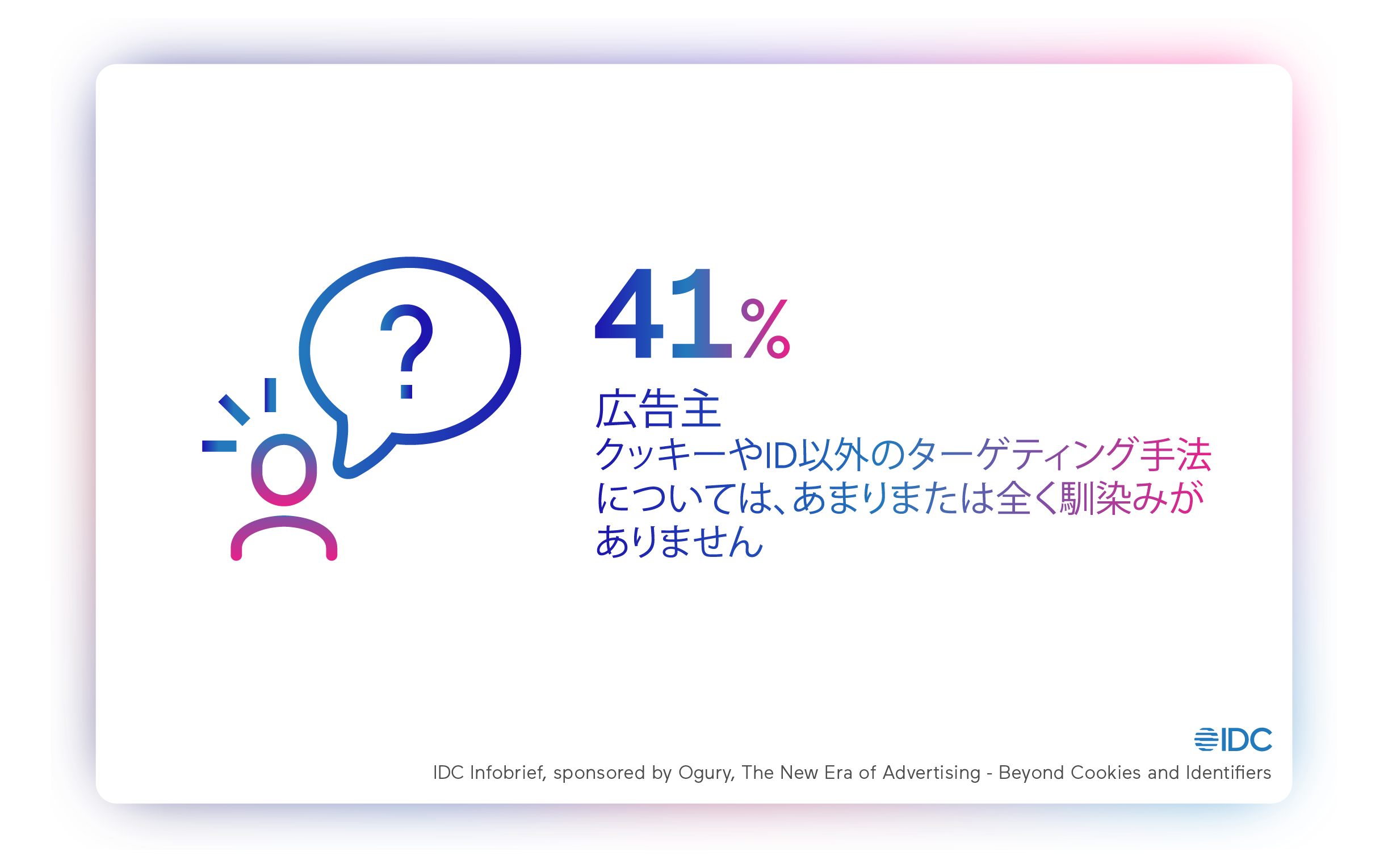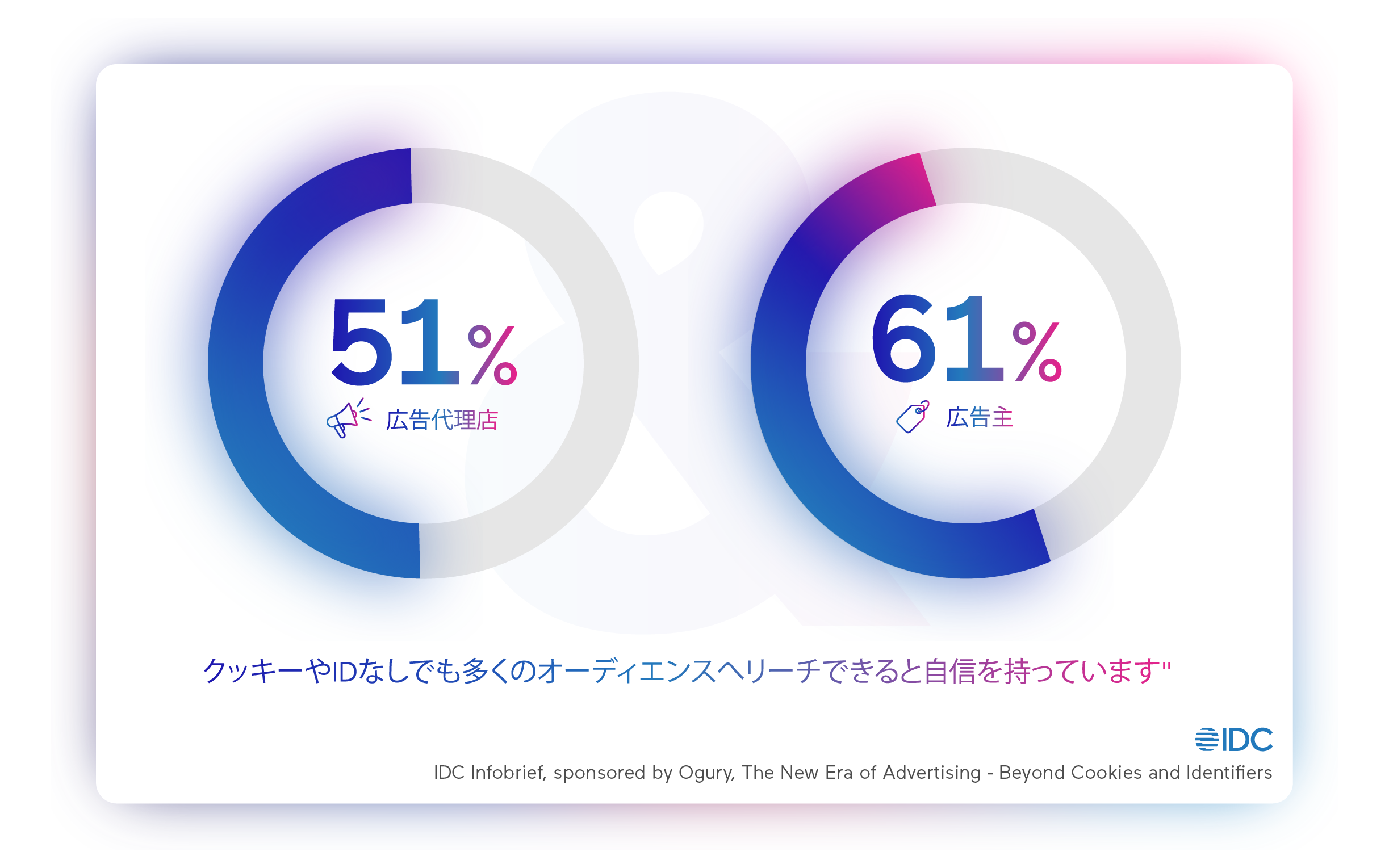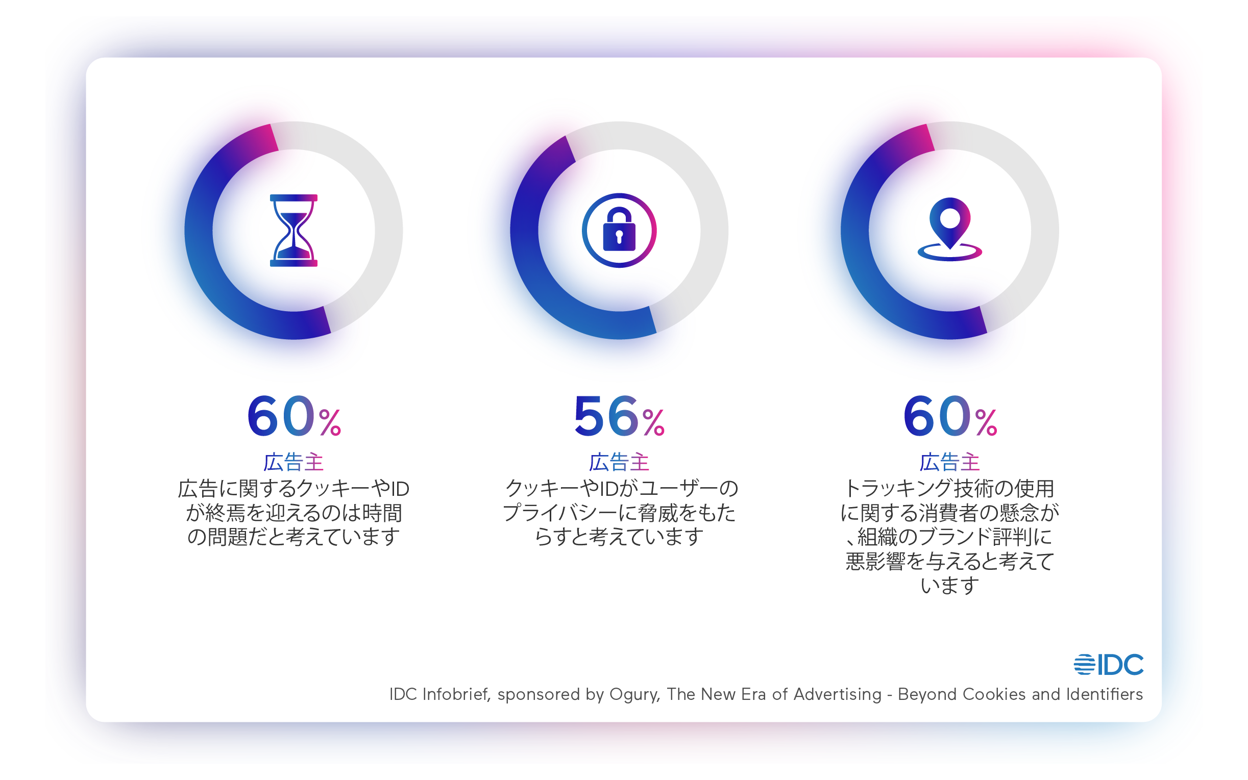 2023年5月11日 – クッキーレス・IDレスに対応したペルソナ・ターゲティング広告をグローバルに展開するOgury(Ogury ltd.、日本法人 : Ogury Japan株式会社)は本日、IT市場調査会社のIDC(International Data Corporation) に委託し、1,000名の主要な広告主と広告会社の役職者を対象とした”クッキーレス社会におけるデジタル広告の未来” に関する調査を行いました。その結果、回答した役職者の大部分 (60%) は、ユーザーを追跡する機能がまもなく時代遅れになると考えていますが、そのうち40%は広告IDやクッキーによらないターゲティングテクノロジーについて詳しくないと回答しました。