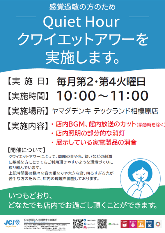 2023年3月、公益社団法人 相模原青年会議所と連携し、ヤマダデンキ店舗において初の試みとして実施、感覚過敏の方とそのご家族がご利用いただきやすいお時間となるよう、一時的に店内の照明やBGMをカットする等、店内の光や音を調整しました。