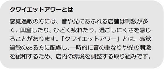 今後、「クワイエットアワー」を定例実施することにより、音や光で過ごしにくさを感じる方の日常的なお困りごとを解決するとともに、感覚過敏についての理解を深めるきっかけとすることを目的として、ご来店くださるすべてのお客様が安心して楽しくお買い物いただける環境づくりに向けて努めてまいります。