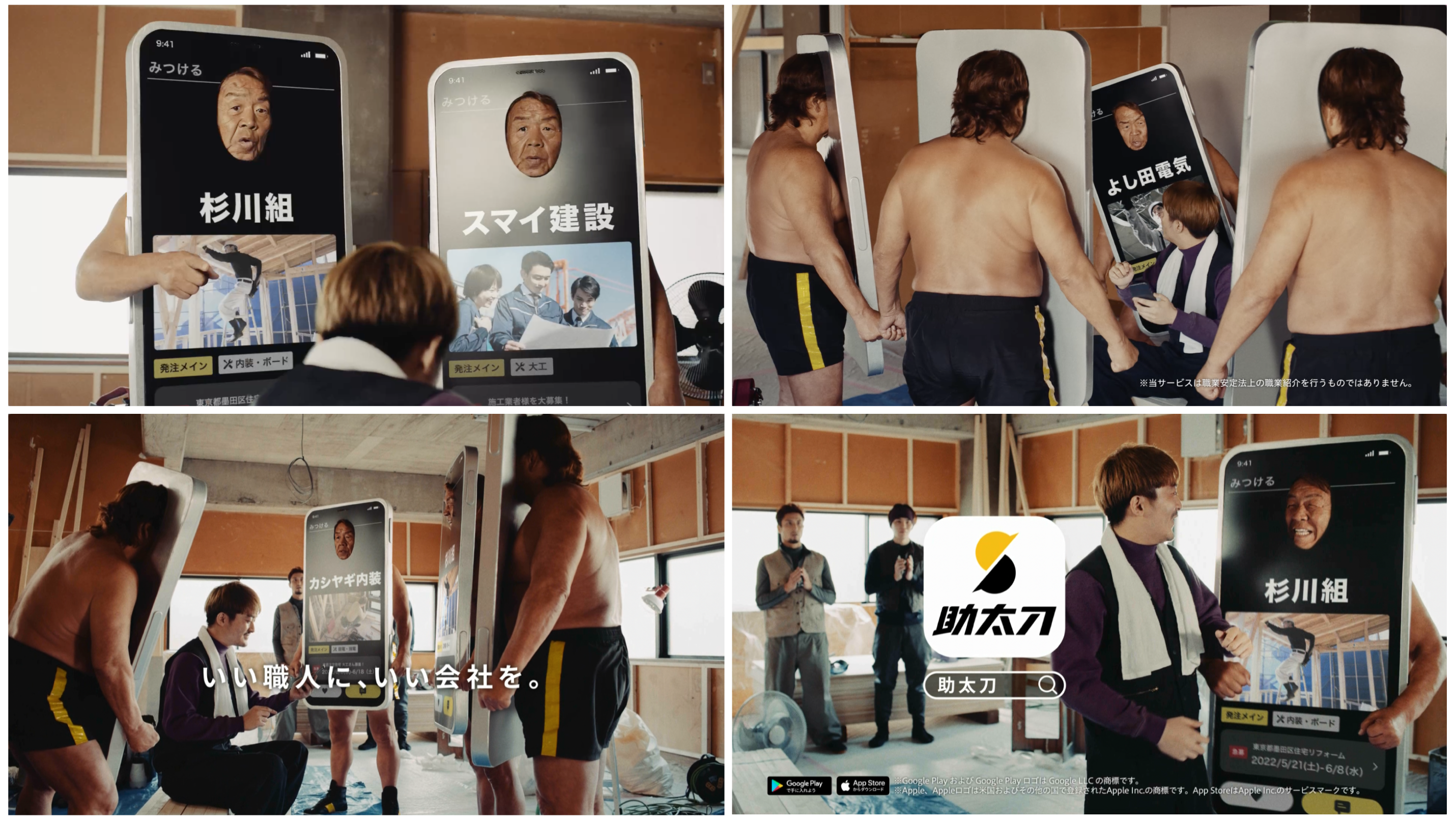 今回のCMでは、当社イメージキャラクターの長州力さんが、職人と工事会社の新しい出会いが見つかるマッチングサービス「助太刀」および、建設業特化の正社員採用サービス「助太刀社員」それぞれのサービスそのものになって登場し、職人さんの工事会社探しや、工事会社の職人さん探しをサポートします。