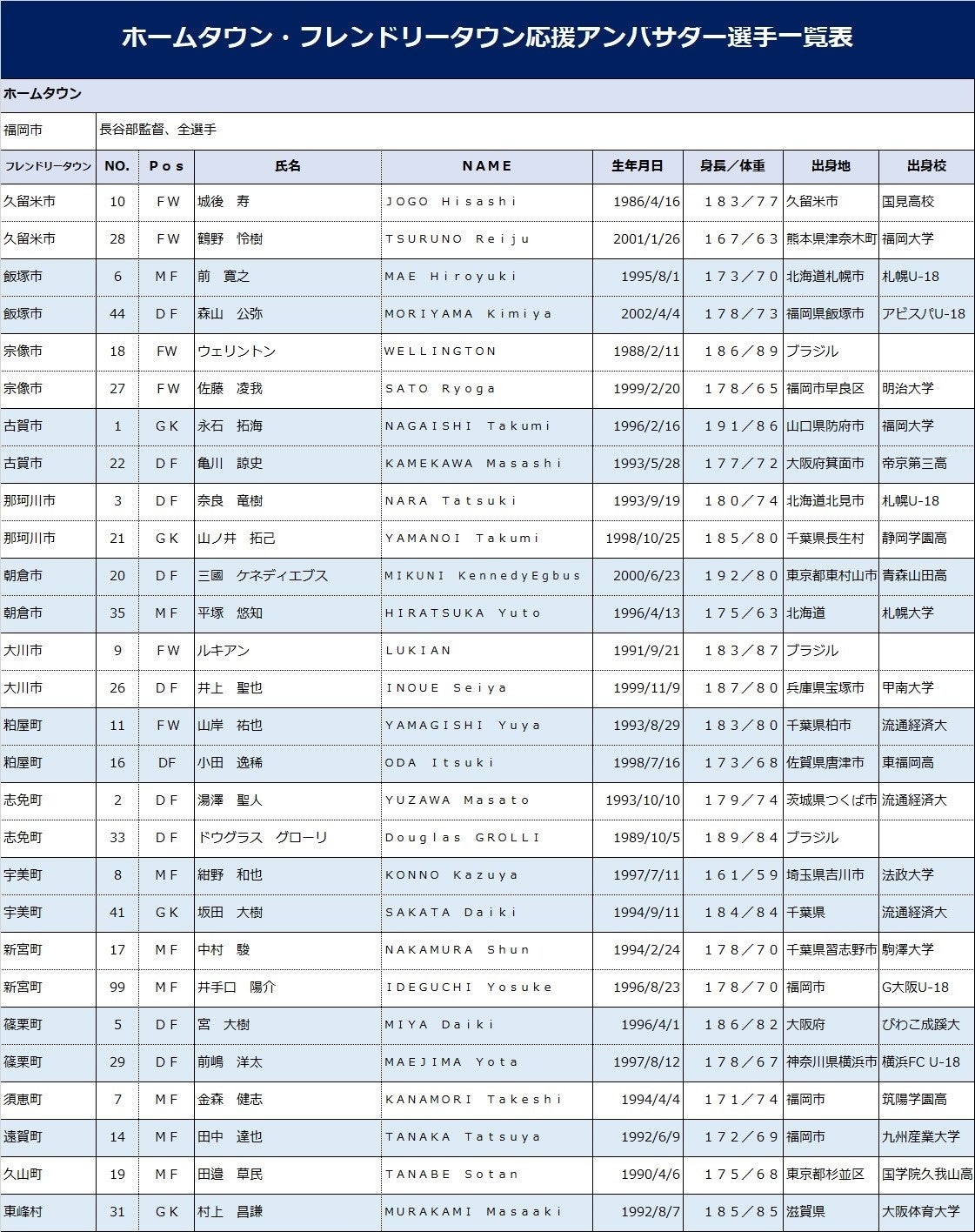アビスパ福岡トップチームに所属する選手たちが、ホームタウン(福岡市)ならびにフレンドリータウン各市町村の応援アンバサダーとして就任し、応援大使として各自治体を盛り上げていくこととなりましたので、お知らせいたします。