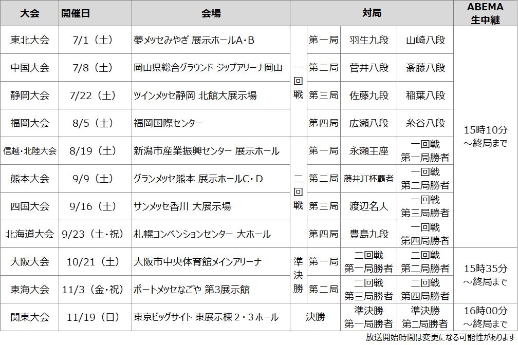 出場棋士は前回優勝の藤井聡太JT杯覇者、2023年2月末時点のタイトルホルダー、2022年賞金ランキング上位者の12名からなる豪華な顔ぶれです。公開対局ならではの緊張感や持ち時間10分という超早指しのスリリングな展開が味わえます。対局終了後には勝利棋士がお客様をお見送りするなど、棋士との交流機会があるのも本棋戦の特長です。また今年から全11会場でオリジナルグッズの販売も開始いたします。対局の模様はABEMAでも生中継されますので、会場にお越しになれない方はABEMAの生中継でお楽しみください。