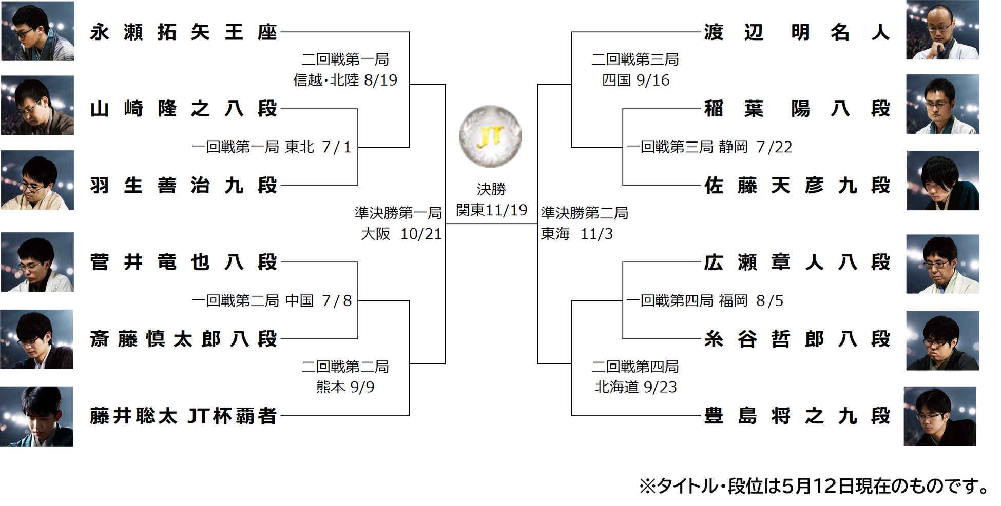 前回優勝者の藤井聡太JT杯覇者、渡辺明名人、永瀬拓矢王座、豊島将之九段がシード。一回戦には「JT杯」5回優勝の羽生善治九段、3年ぶり出場の佐藤天彦九段、昨年準優勝の斎藤慎太郎八段など実力者揃いです。今年の覇者は一体誰になるのか。将棋ファンなら見逃せない熱い戦いがいよいよ始まります。