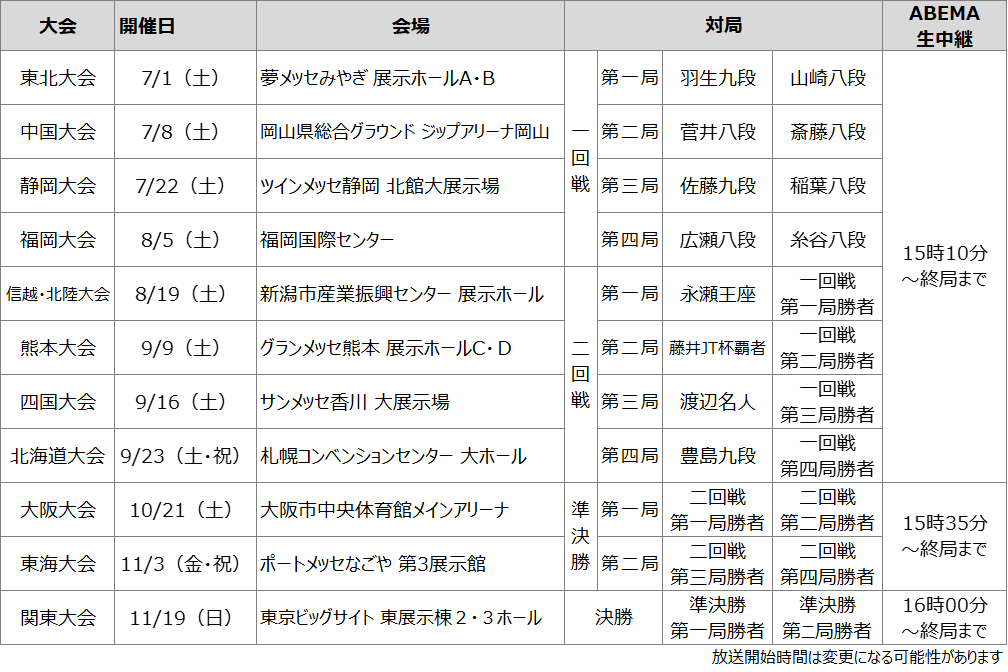 出場棋士は前回優勝の藤井聡太JT杯覇者、2023年2月末時点のタイトルホルダー、2022年賞金ランキング上位者の12名からなる豪華な顔ぶれです。公開対局ならではの緊張感や持ち時間10分という超早指しのスリリングな展開が味わえます。対局終了後には勝利棋士がお客様をお見送りするなど、棋士との交流機会があるのも本棋戦の特長です。また今年から全11会場でオリジナルグッズの販売も開始いたします。対局の模様はABEMAでも生中継されますので、会場にお越しになれない方はABEMAの生中継でお楽しみください。