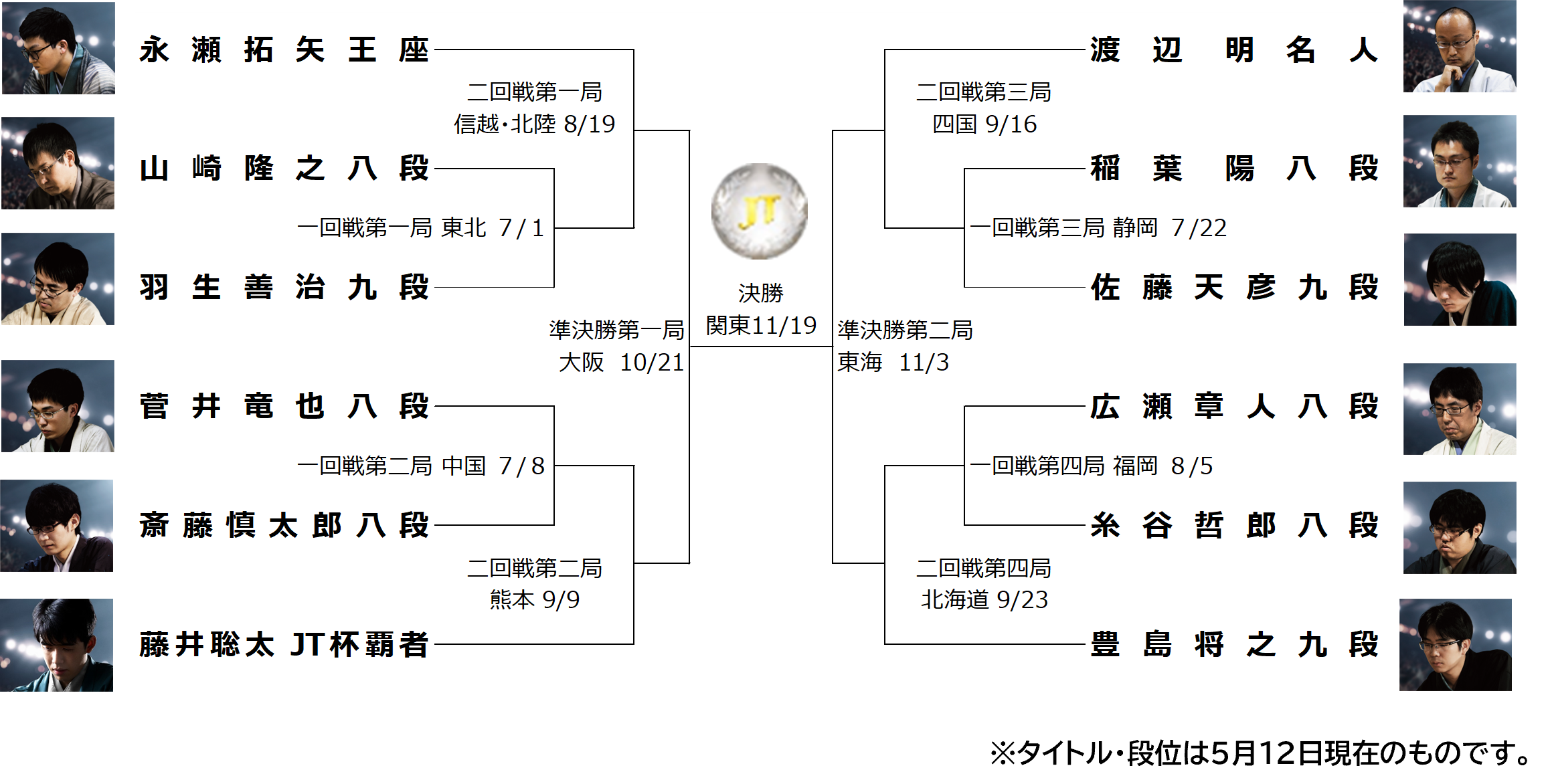 前回優勝者の藤井聡太JT杯覇者、渡辺明名人、永瀬拓矢王座、豊島将之九段がシード。一回戦には「JT杯」5回優勝の羽生善治九段、3年ぶり出場の佐藤天彦九段、昨年準優勝の斎藤慎太郎八段など実力者揃いです。今年の覇者は一体誰になるのか。将棋ファンなら見逃せない熱い戦いがいよいよ始まります。