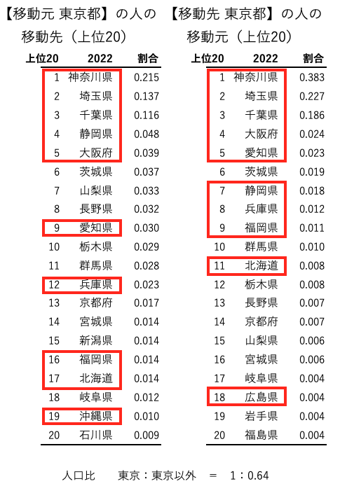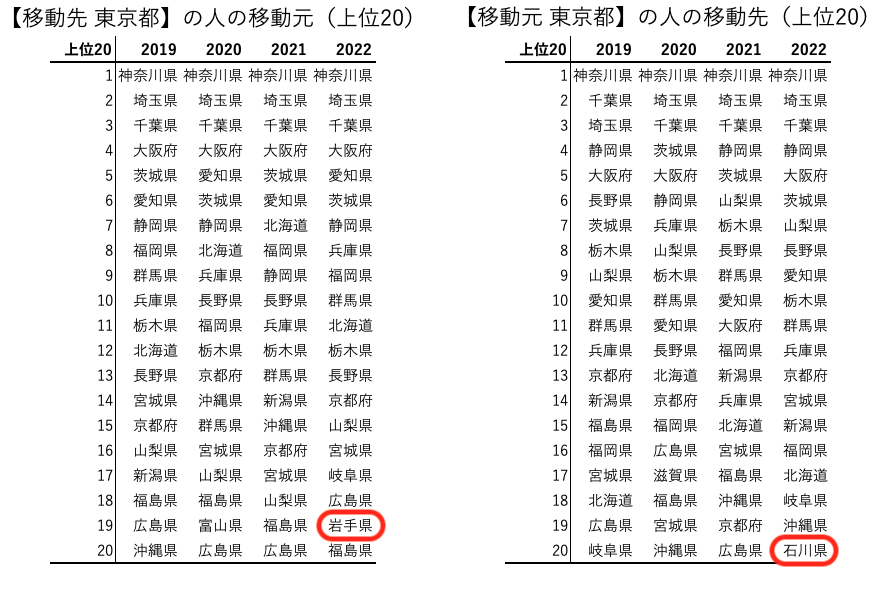 2022年の移動先に岩手が、移動元に石川が表れている以外は違いはそこまで無いように見えます。