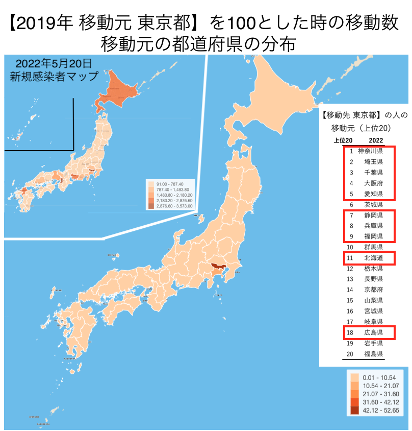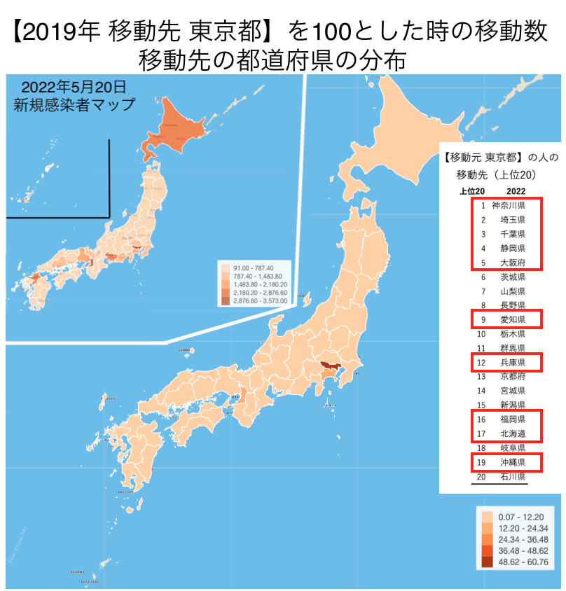 新規感染者1000人を超えているエリアは、東京都を基準にしたものとの比較になりますが、東京都から出た人の移動先の都道府県上位20に入っていることがわかります。
