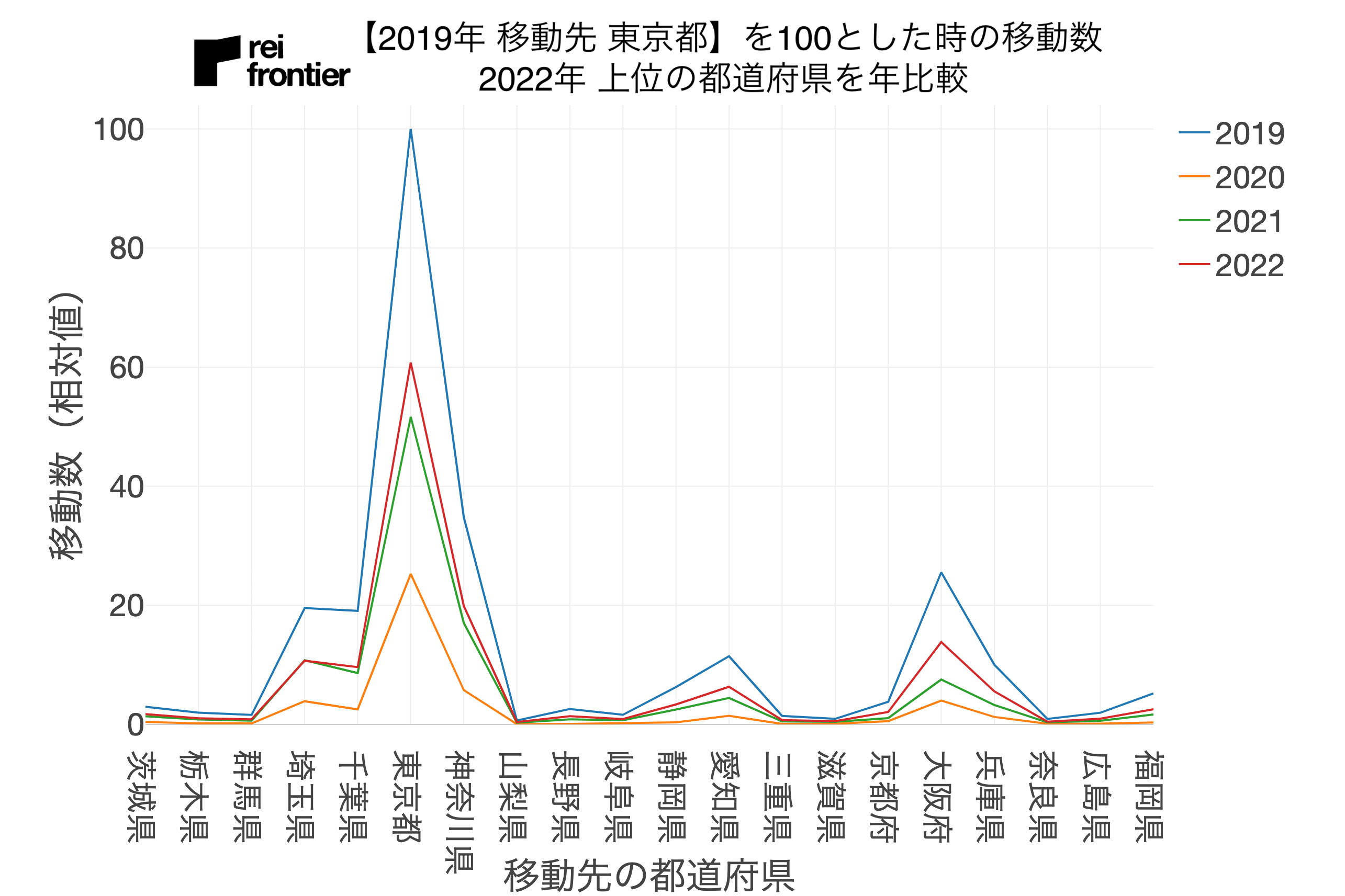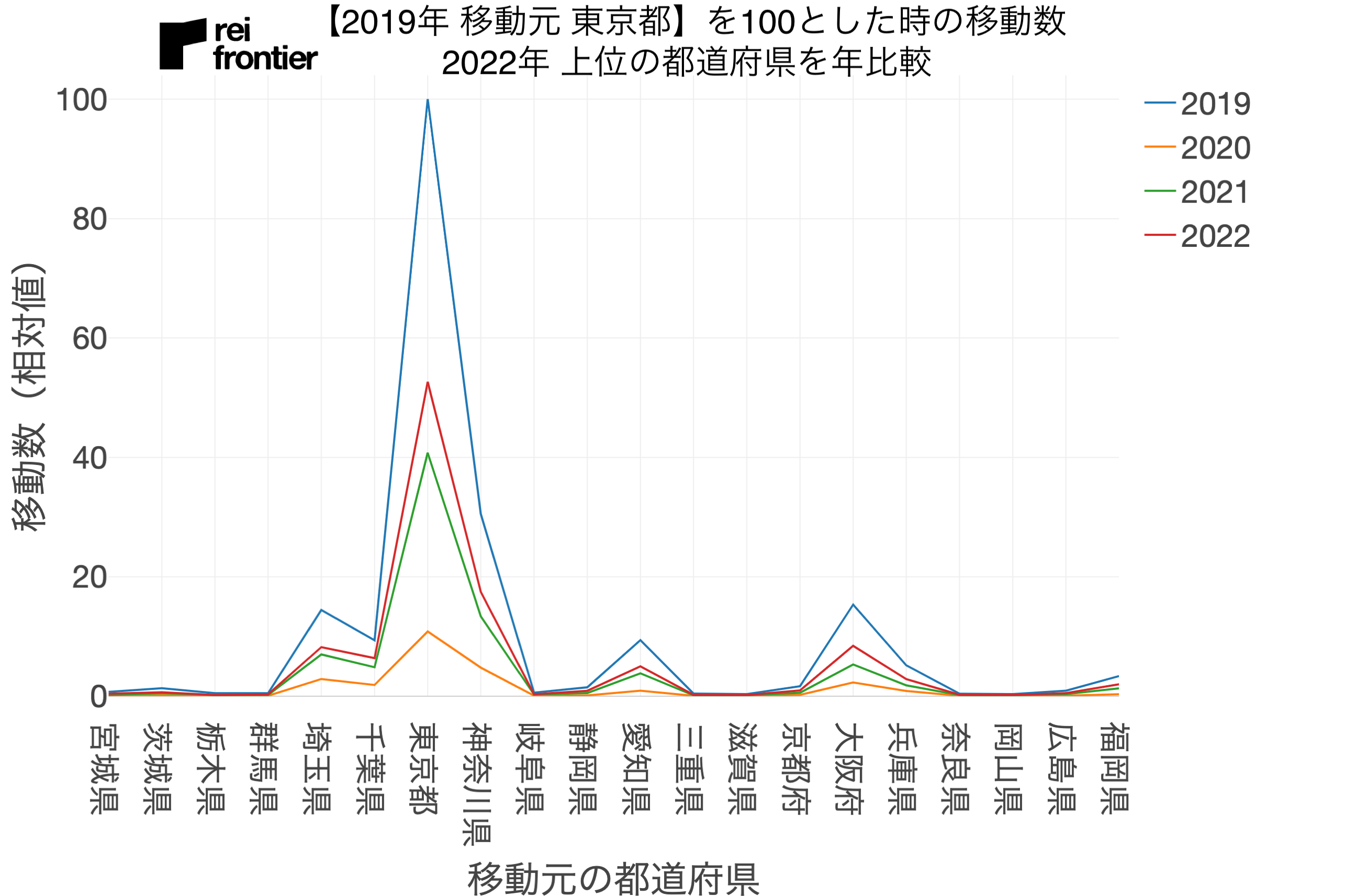 こちらも2019年から2022年までの4年分のデータで、「2019年の移動元が東京都」を100とした時の、移動元別の他県への移動数を表しています。