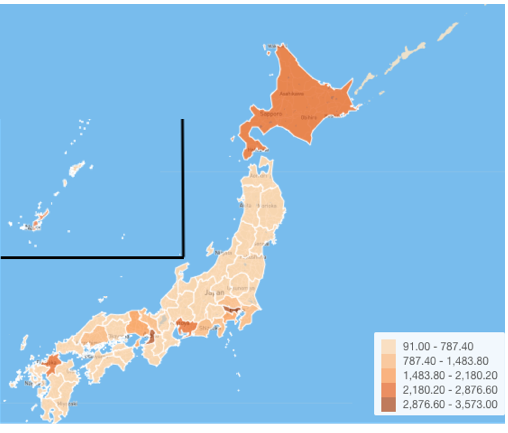 移動元の都道府県をマップ上に可視化したものになります。