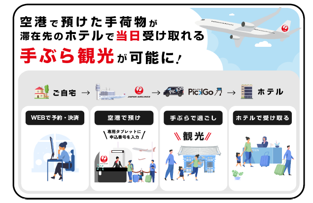 予約・決済はすべてJALのWebサイト上で完結し、対面接触の機会ならびに時間を極小化したサービスとなっており、安全・安心にご利用いただくことが可能です。羽田空港到着後のお手荷物の輸送については、JAL ABCを通じてCBcloud配送サービス「PickGo」が行います。