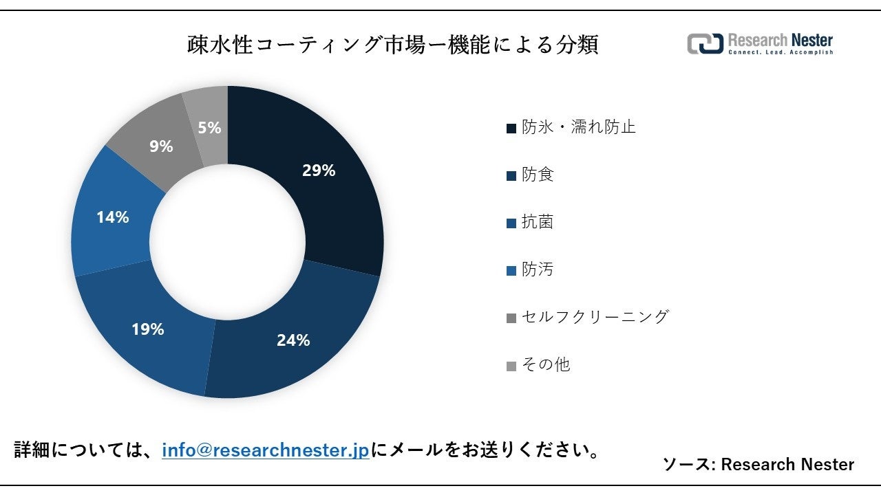 世界の疎水性コーティング市場はまた、防食、抗菌、防汚、防氷/濡れ防止、セルフクリーニングなどの機能別に需要と供給を分割して分析しています。これら 6 つのセグメントのうち、防氷/濡れ防止セグメントは 2035 年には約 30% 程度の大きなシェアを獲得すると予想されます。当社の疎水性コーティング市場調査によると、氷は、小さな雲滴が衝突し、車両や飛行機の前縁または前面で凍るときに形成されることがよくあります。表面の氷結は人命と財産に多大な損失をもたらす可能性があるため、新しい防氷ソリューションを直ちに使用する必要があります。この部門の成長は航空機と自動車の生産増加によるものです。