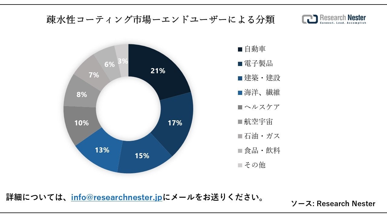 当社の世界の疎水性コーティング市場調査によると、市場は、自動車、電子製品、建築・建設、海洋、繊維、ヘルスケア、航空宇宙、石油・ガス、食品・飲料などにエンドユーザーごとに需要と供給を細分化して分析されています。疎水性コーティングのエンドユーザー 9 社のうち、自動車部門は 2035 年までに最大約 25% の最大の市場シェアを獲得すると推定されています。この部門の成長は自動車生産の増加によるものと考えられます。車両の疎水性コーティングにより防水シールが形成されます。2021 年には世界で 67百万台以上の自動車が販売され、2022 年には 66百万台以上が販売されました。さらに、2023 年末までに自動車販売台数は約 70百万台に達すると予測されています。