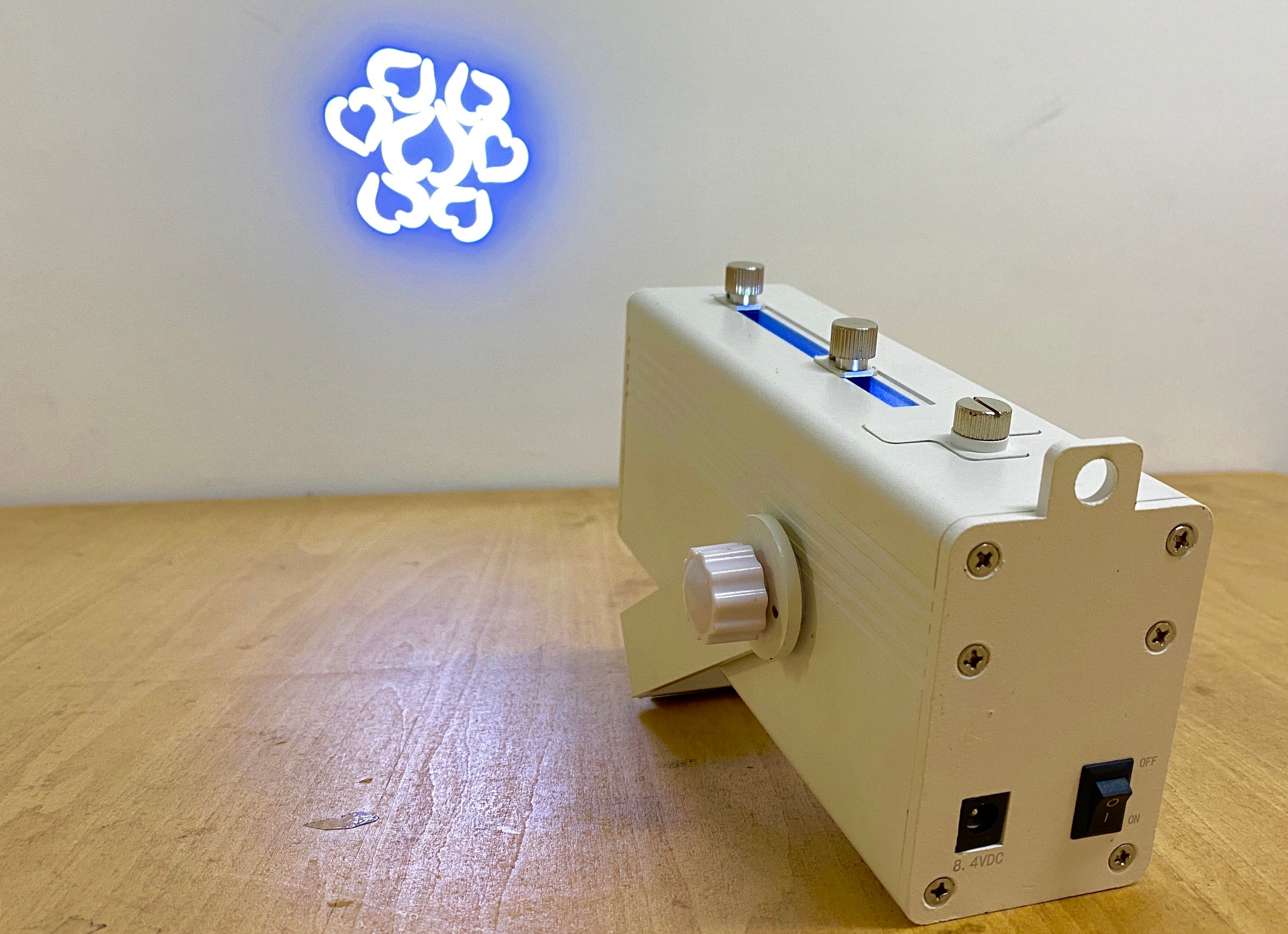 電源ONで即ゴボ投射 簡単なズームとピント調整機能付 バッテリー内蔵で最大4時間投射可能
